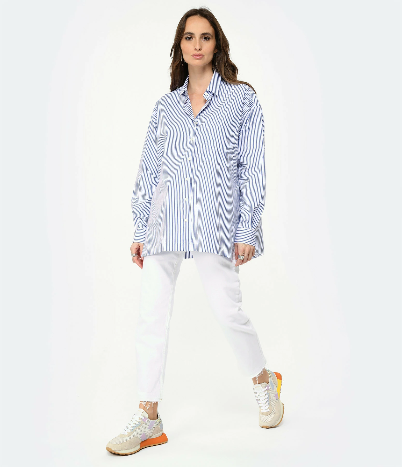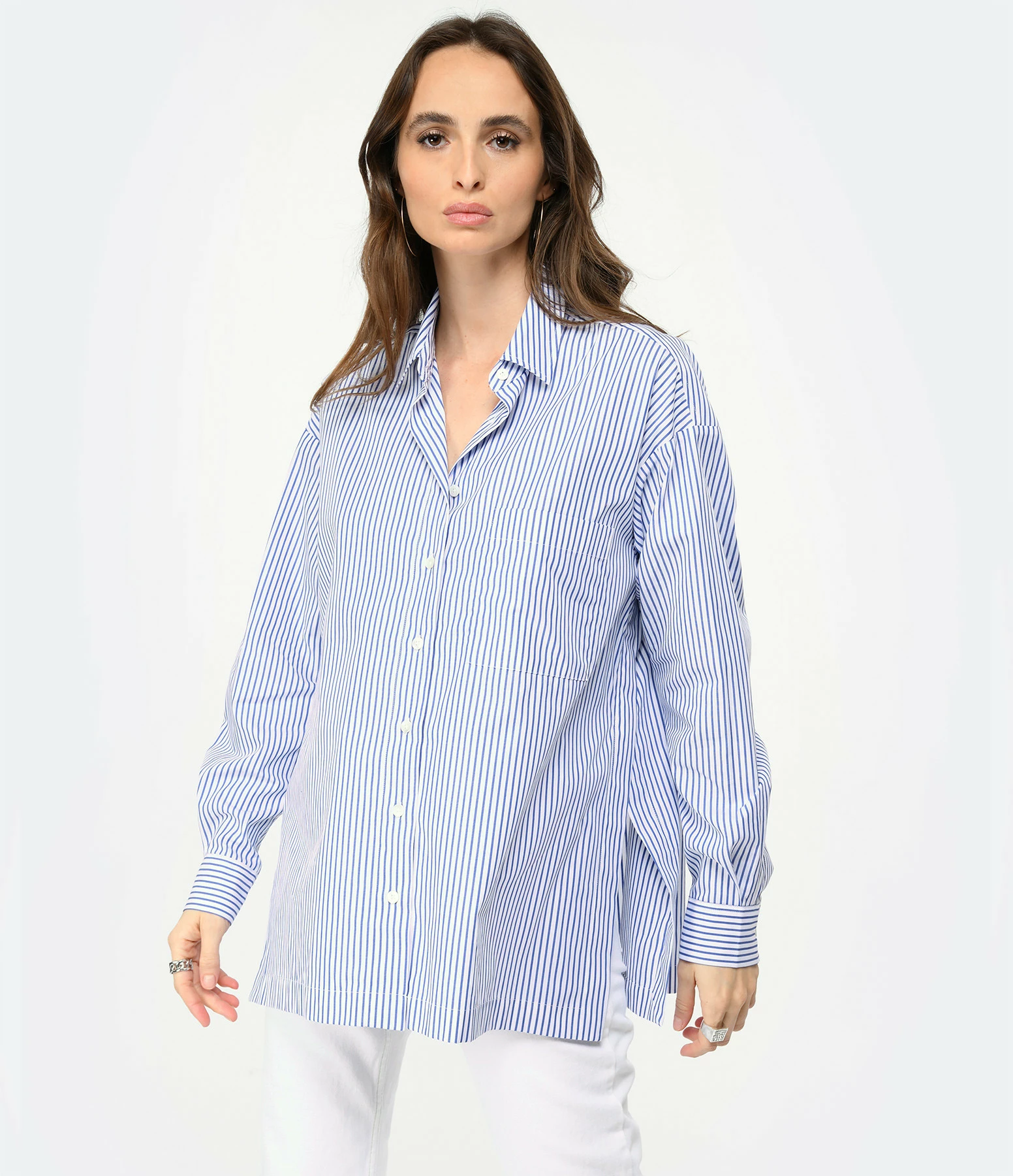 Chemise en coton rayée bleu et blanc. Col à pointes. Poche plaquée sur la poitrine. Fermeture par boutons nacré. Coupe ample. Base droite avec fentes sur les côtés.