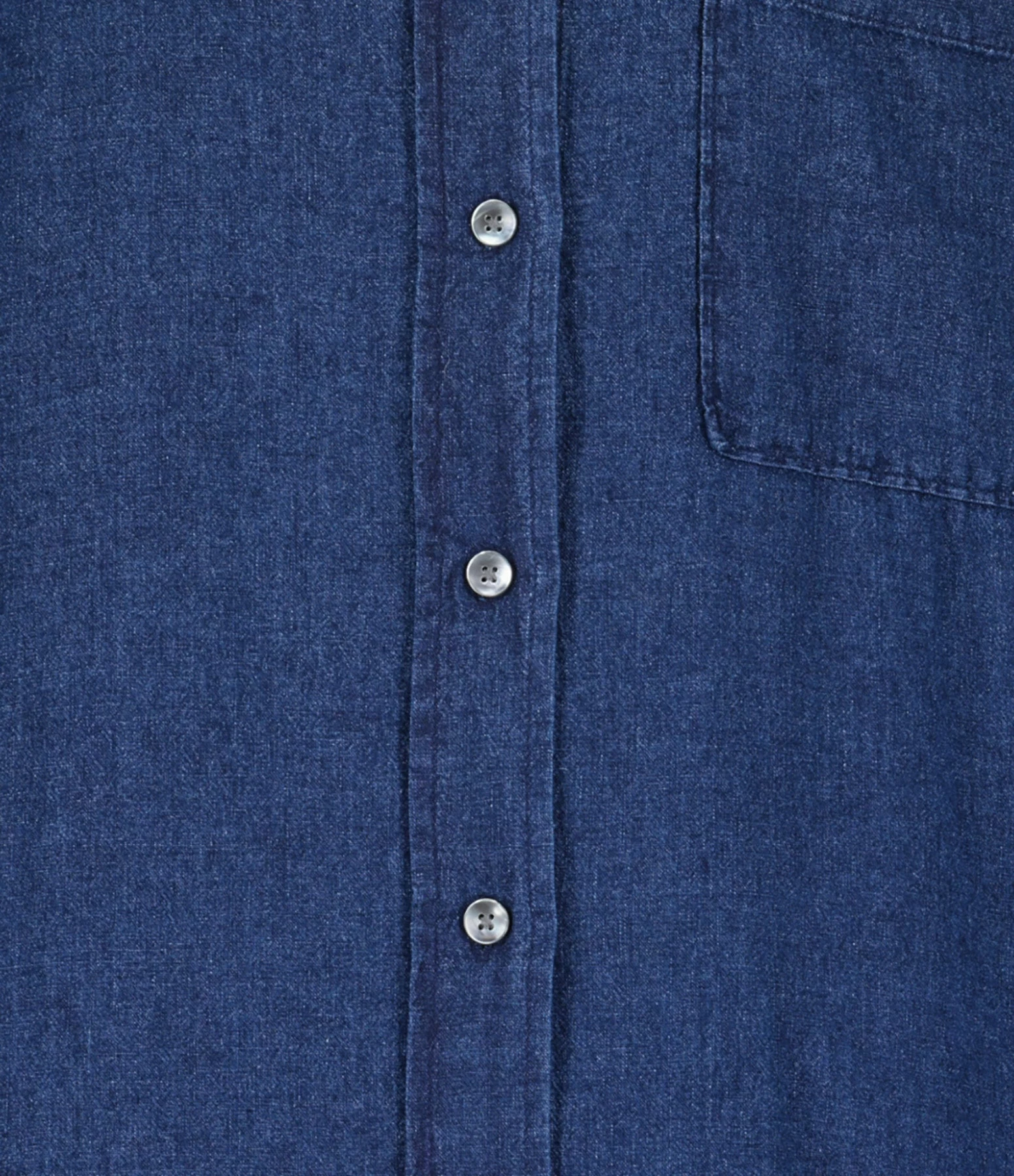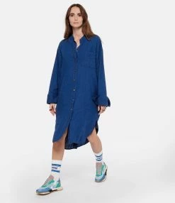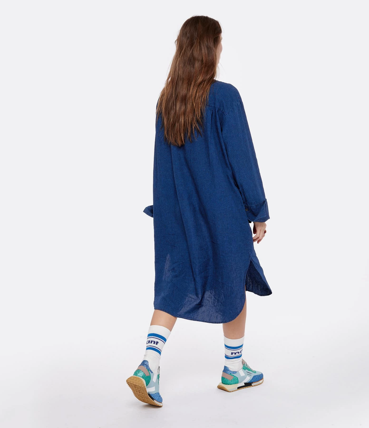 Robe chemise en lin bleu. Col rond. Poche plaquée sur la poitrine. Fermeture par boutons nacré. Deux poches cachées dans les coutures. Coupe ample. Base arrondie, plus longue à l’arrière.