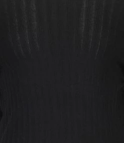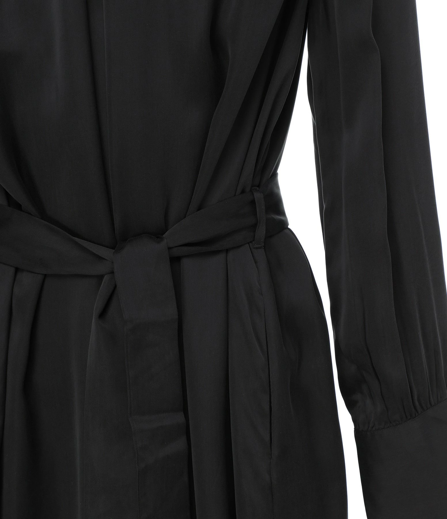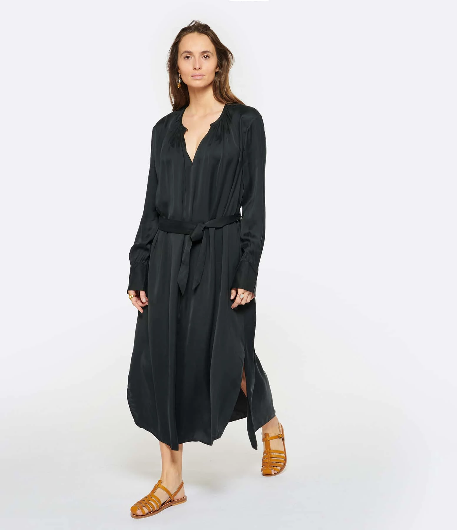 Robe longue noire. Col rond froncé avec légère ouverture sur le devant. Manches longues. Ceinture à nouer à la taille. Fentes latérales sur le bas. Coupe droite. Base droite.