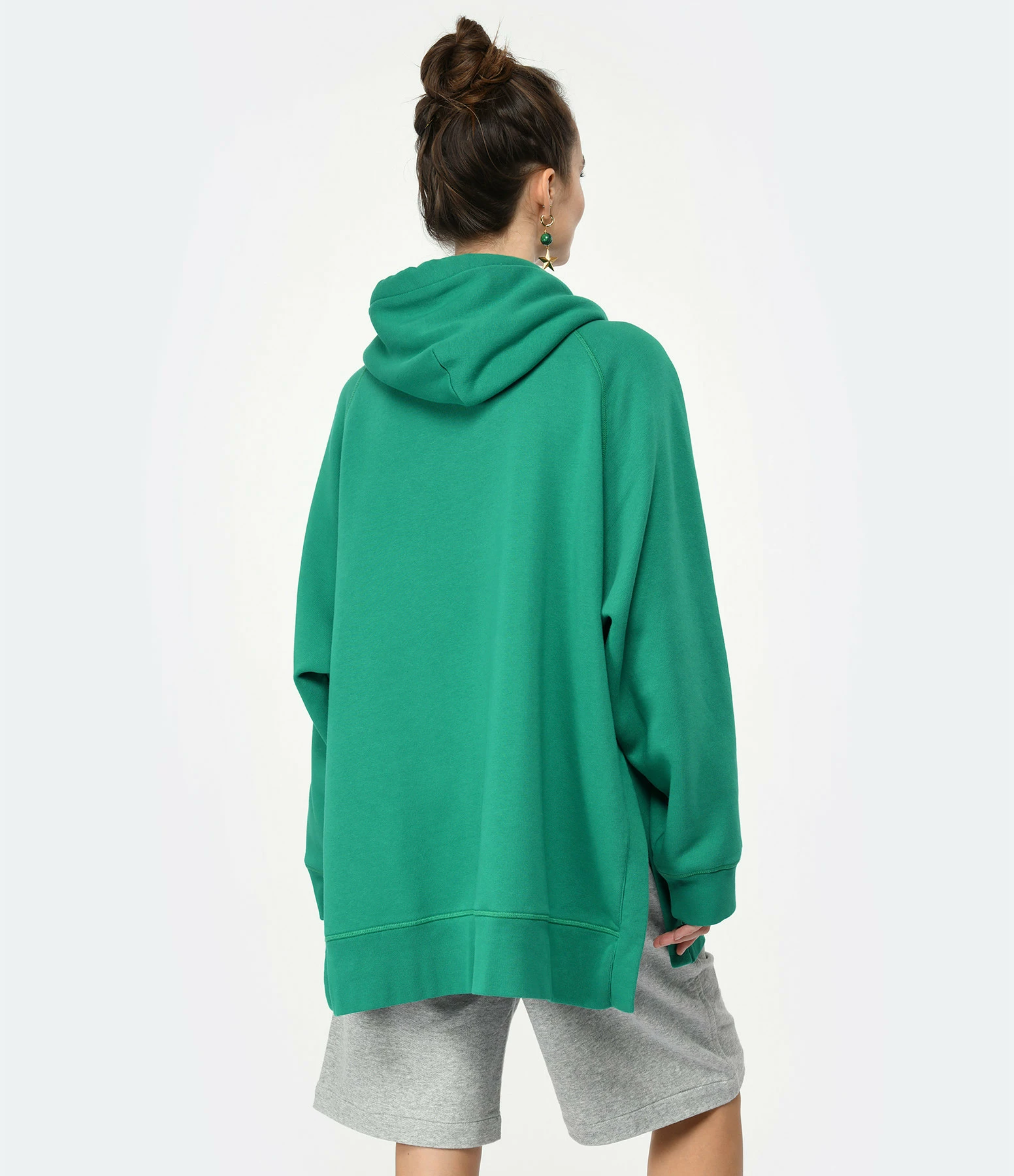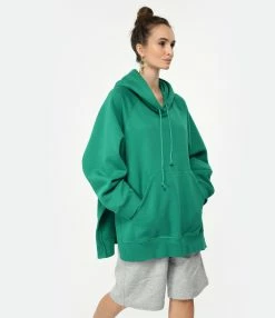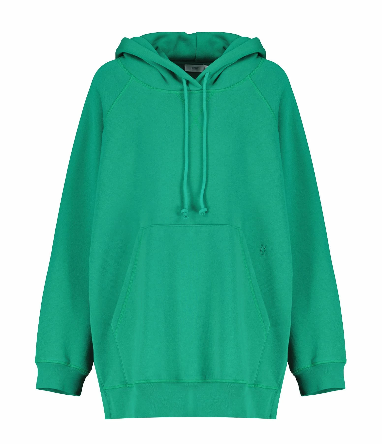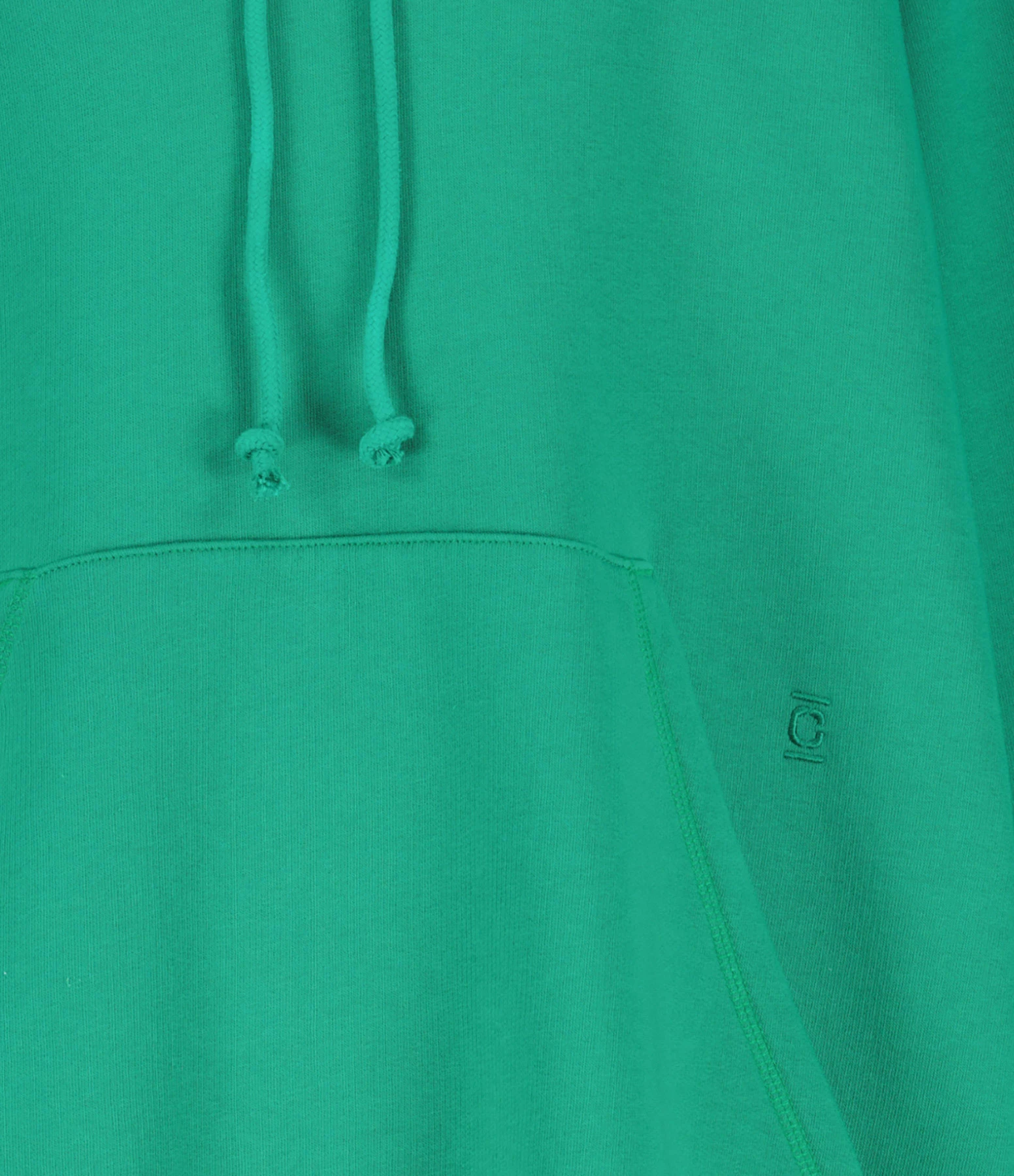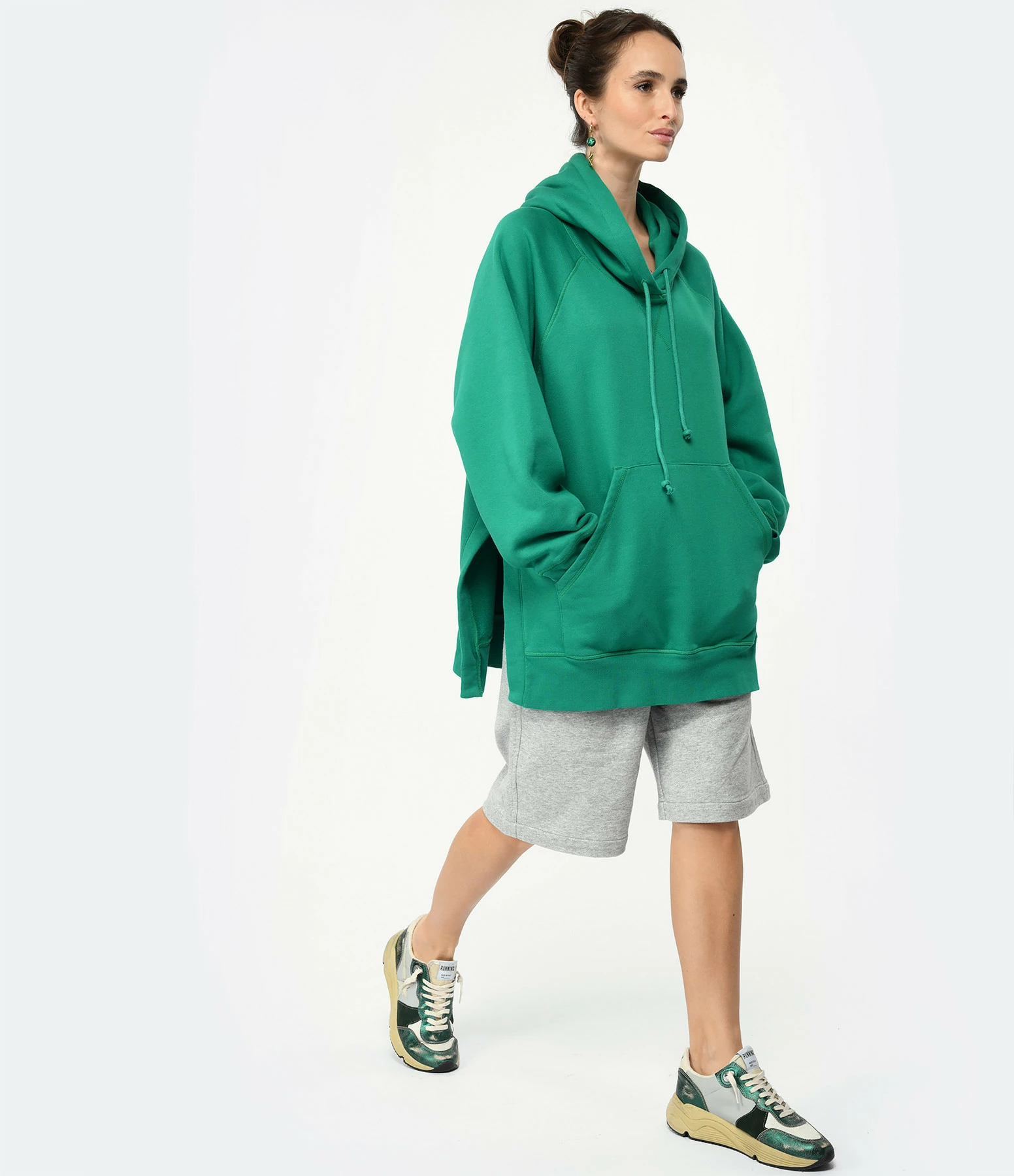 Sweatshirt en coton vert. Capuche avec liens de serrage. Poche kangourou. Manches longues. Base et poignets resserrés par bords côtes. Coupe ample. Base droite fendue sur les côtés.
