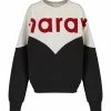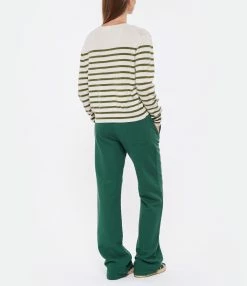 Pull en cachemire blanc à rayures kaki. Col rond côtelé. Manches longues avec poignets côtelés. Coupe droite. Base droite côtelée.