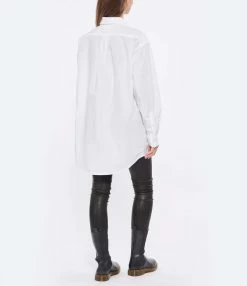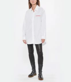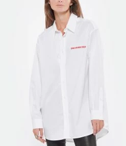 Chemise en coton blanc. Inscription brodée rouge “Disconnected” sur la poitrine. Col chemisier. Fermeture boutonnée. Manches longues. Coupe ample. Base droite.