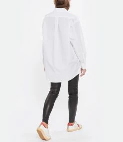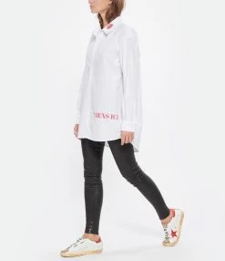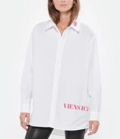 Chemise en coton blanc. Inscription rouge “VIENS ICI” à l’avant. Imprimé bouche sur le col. Col chemisier. Fermeture boutonnée. Manches longues. Coupe ample. Base droite.