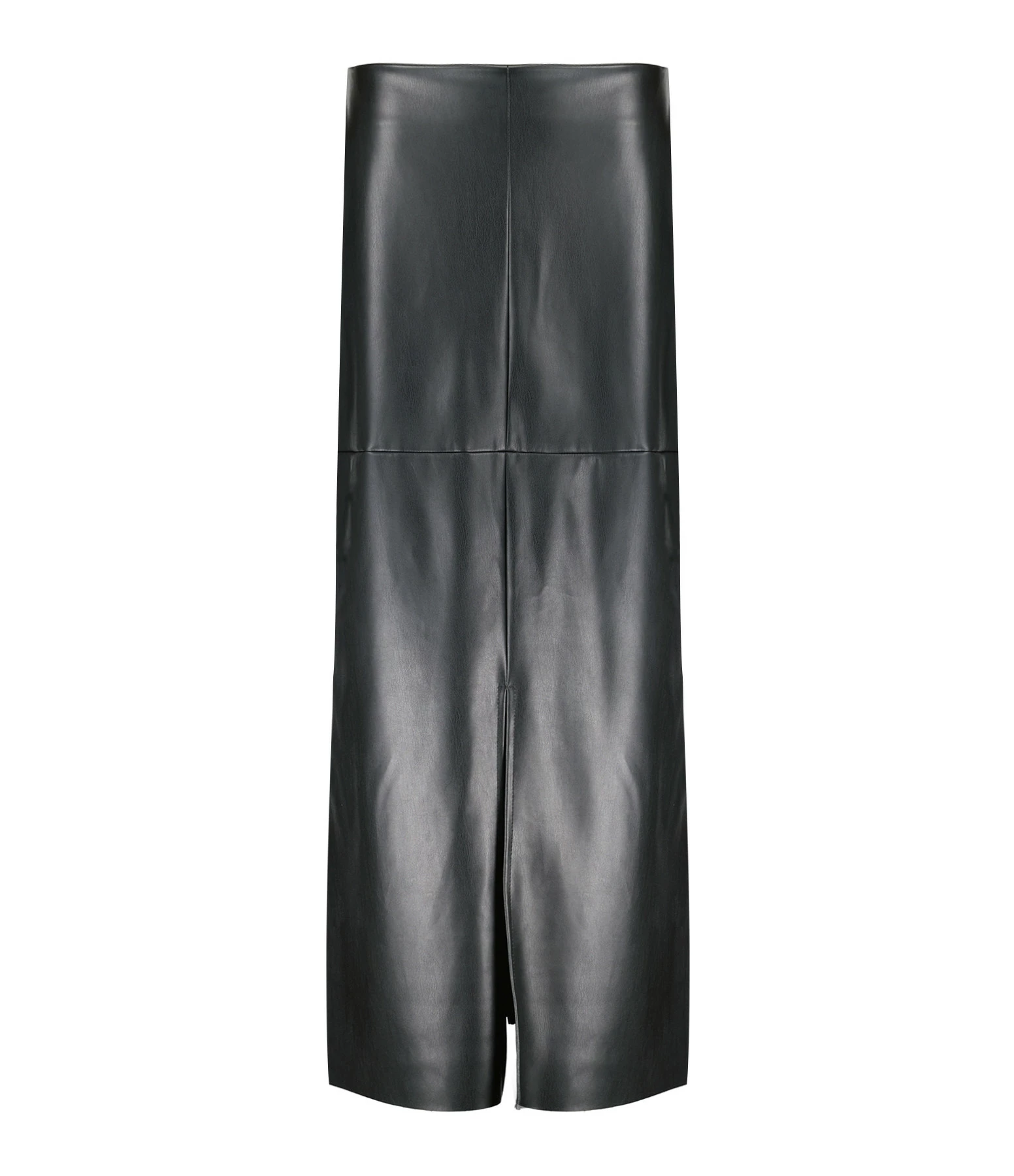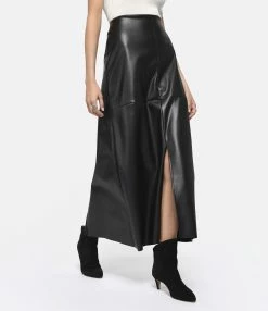Jupe longue en simili cuir noir. Fentes à l’avant et à l’arrière. Coutures apparentes. Fermeture par zip sur le côté. Coupe droite.