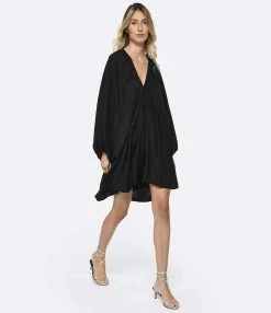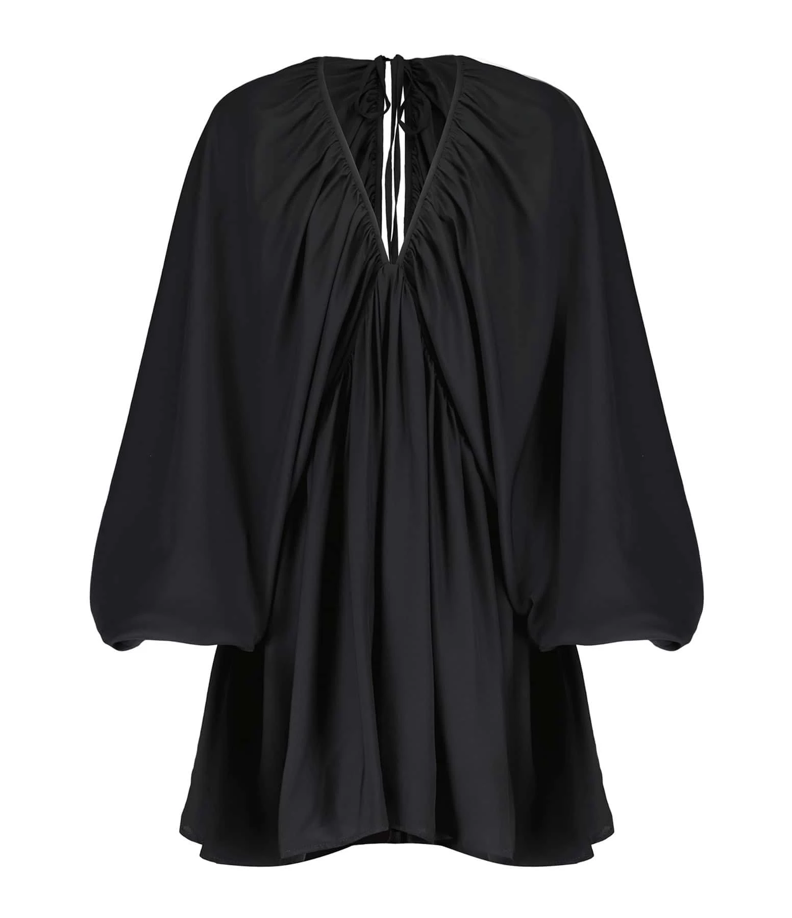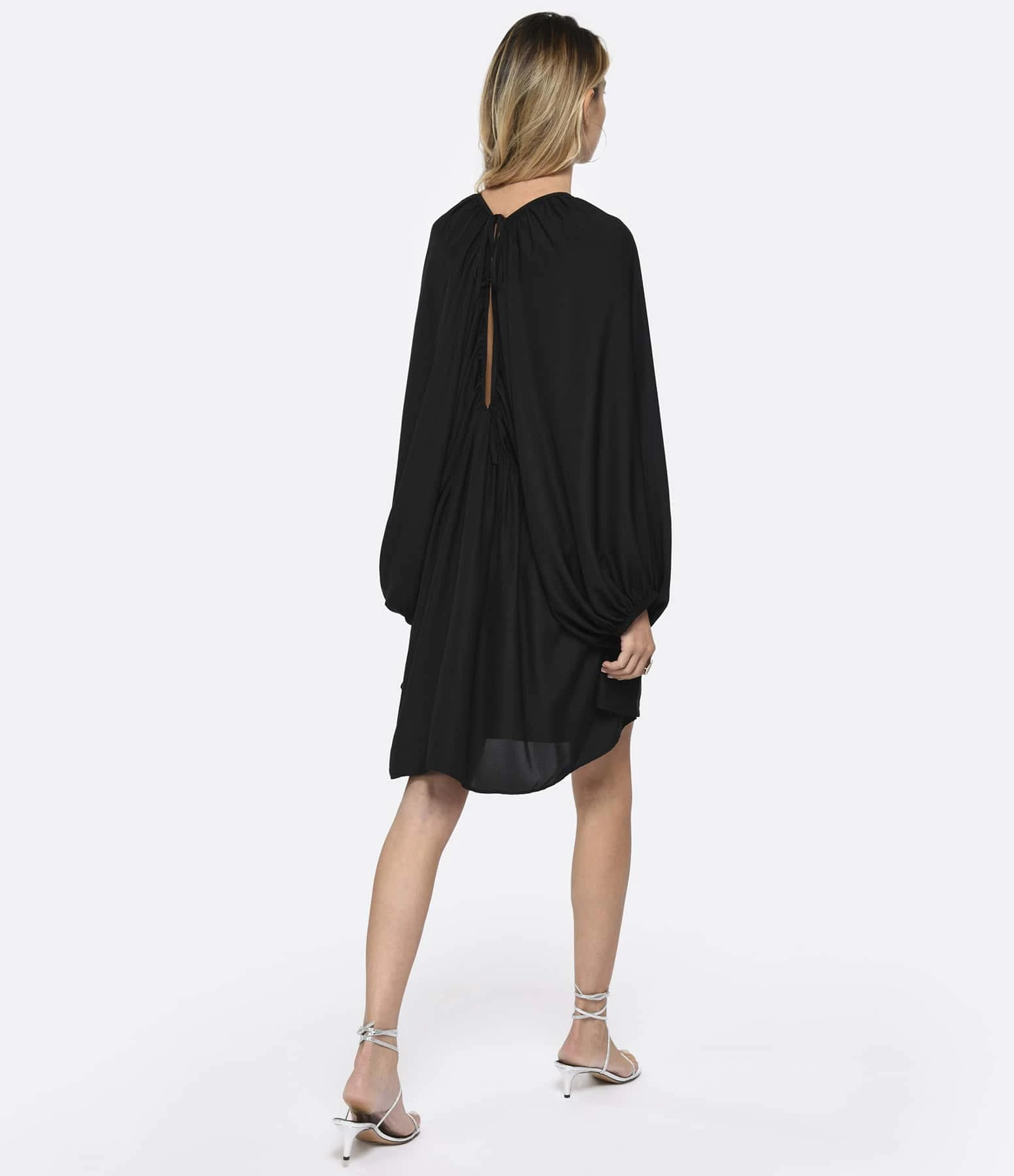 Robe fluide à manches longues bouffantes. Fronces sur la poitrine et au dos. Col V, dos nu avec lien à nouer.