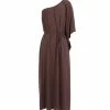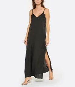 Robe longue en satin de coton noir. Col en V. Fines bretelles. Sans manches. Dos échancré en V. Fentes latérales. Coupe droite. Base droite. Non doublée.