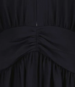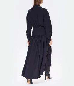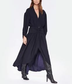 Robe longue bleu marine. Col en V profond avec crochet de réglage. Manches longues avec fronces au niveau des poignets. Taille froncée marquée par une ceinture. Fermeture zippée invisible latérale. Fente milieu devant. Coupe buste ample. Coupe jupe évasée. Base arrondie.