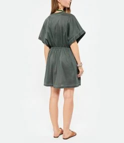 Robe courte de plage en coton vert sauge. Col V. Manches courtes. Cintrée à la taille. Base droite.
