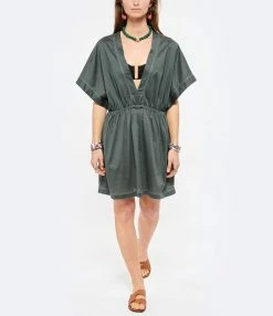 Robe courte de plage en coton vert sauge. Col V. Manches courtes. Cintrée à la taille. Base droite.