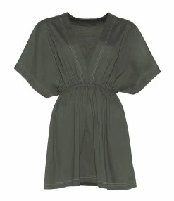 Robe courte de plage en coton vert sauge. Col V. Manches courtes. Cintrée à la taille. Base droite.