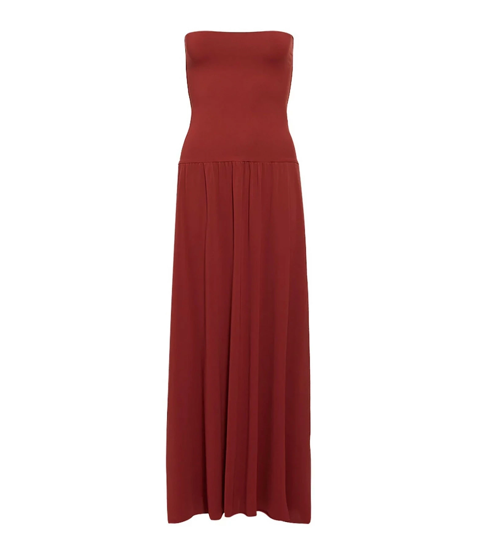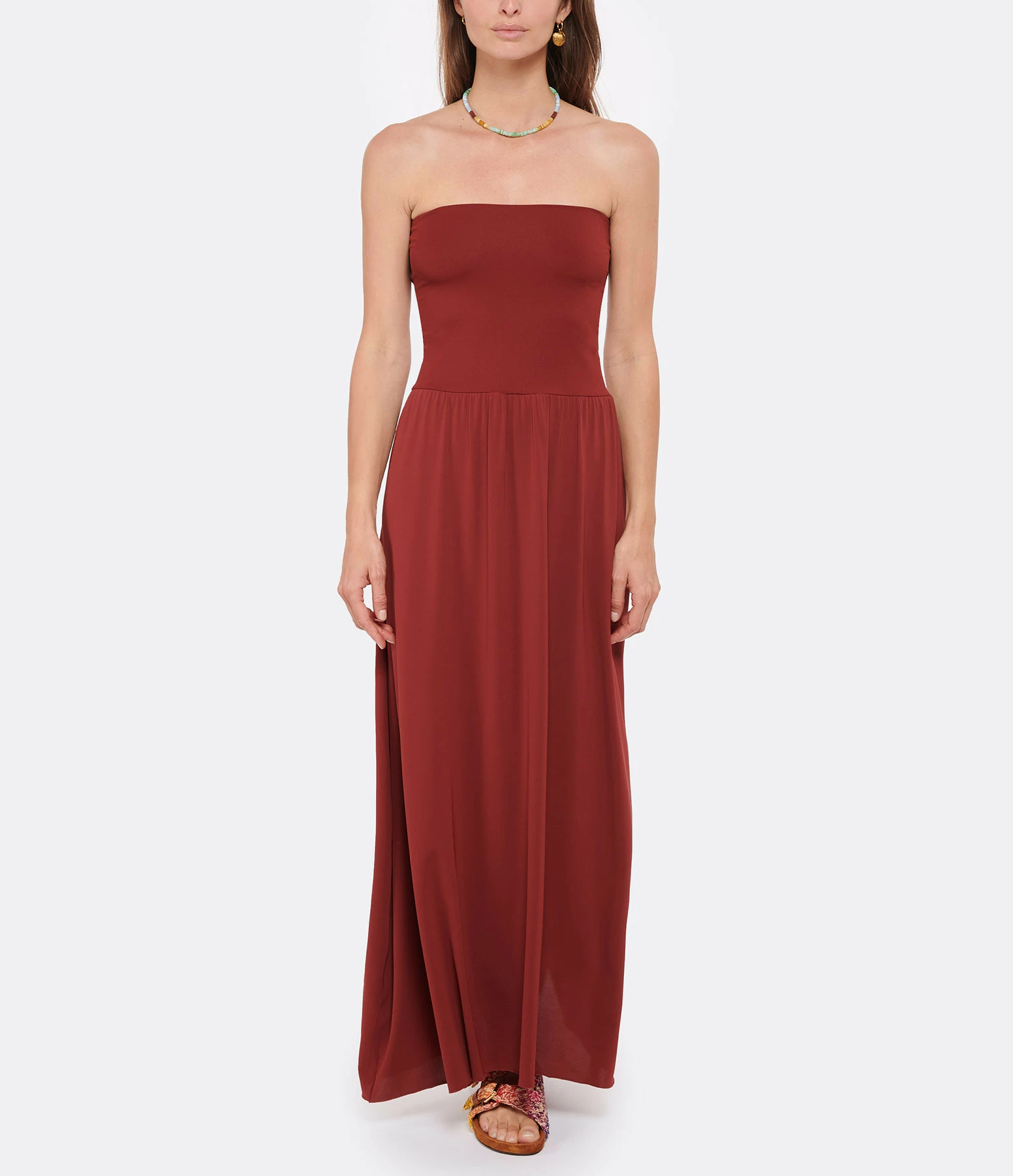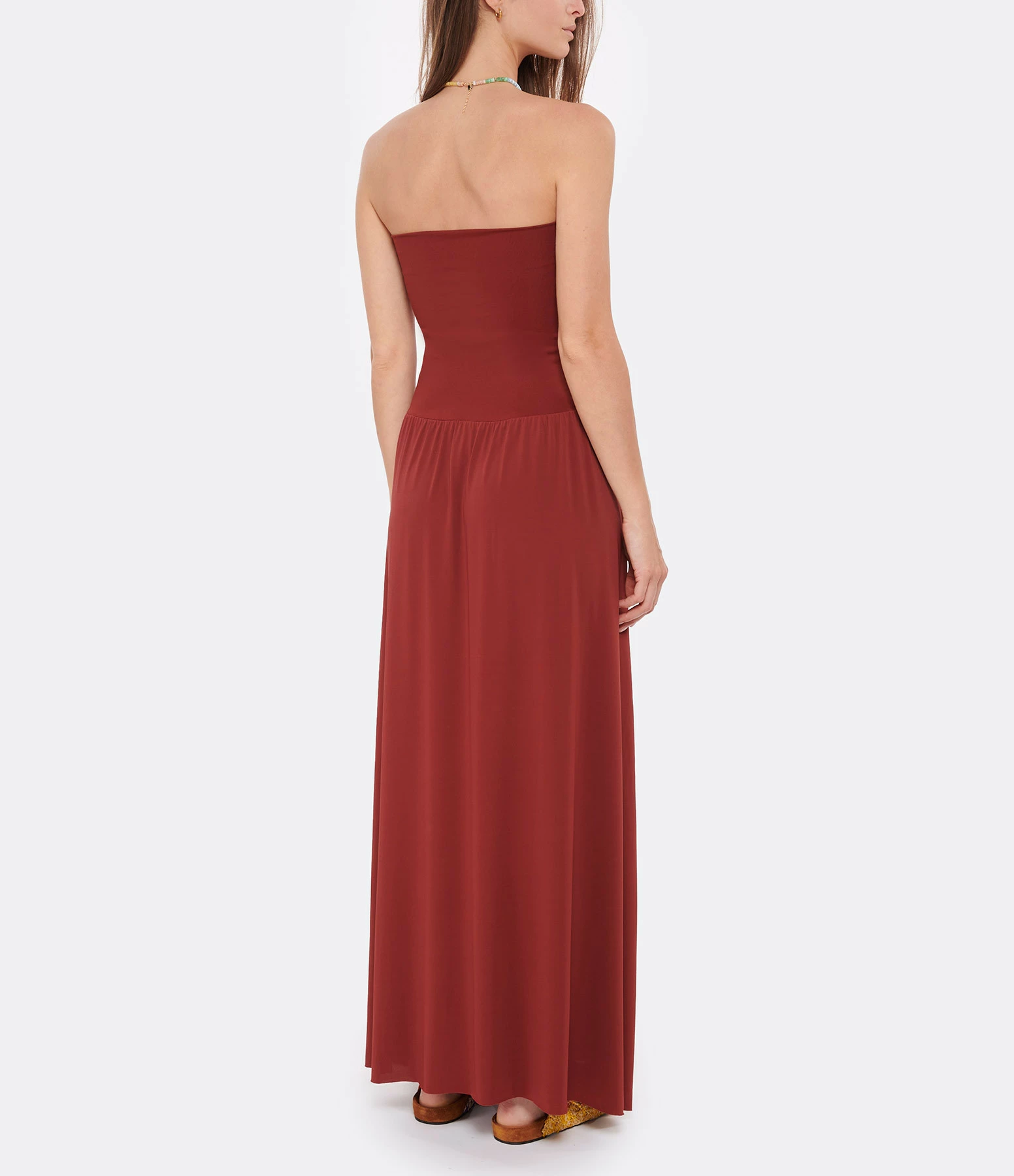 Robe longue bustier rouge foncé. Matière fluide et élastiquée. Fronces à la taille. Buste ajusté et jupe ample évasée. Base droite.