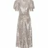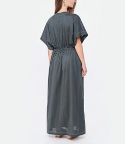 Robe longue en coton gris vert. Manches courtes évasées. Col plongeant. Coupe droite. Base droite.