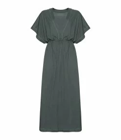 Robe longue en coton gris vert. Manches courtes évasées. Col plongeant. Coupe droite. Base droite.