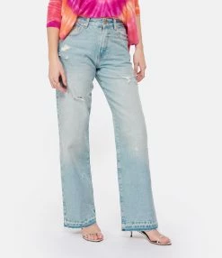 Jean large en denim de coton bleu clair. Effet usé par endroit. Passants pour ceinture. Cinq poches. Coupe boyfriend. Base droite coupée à cru.