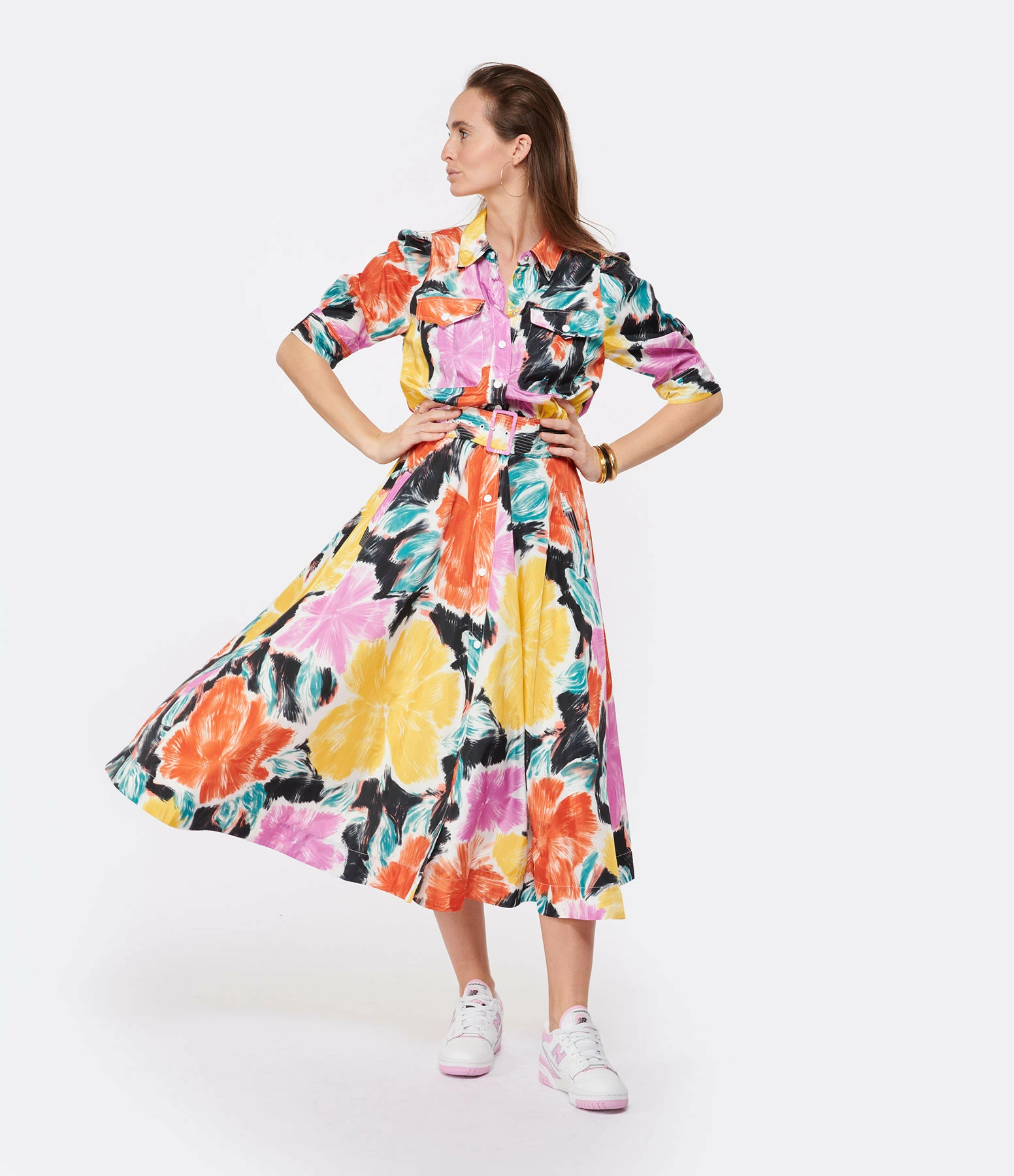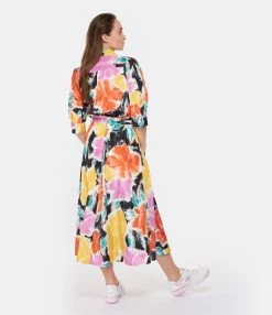 Robe mi-longue imprimé fleuri multicolore. Col chemisier. Fermeture par boutons sur le devant. Manches trois-quarts. Ceinture assortie ajustable à la taille. Deux poches rabats au niveau de la poitrine. Poches latérales. Coupe évasée. Base droite.