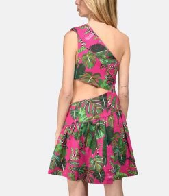 Robe courte à imprimé vert et rose. Asymétrique au niveau des épaules, une dénudée et une à bretelle large. Ouverture au niveau du ventre et de la hanche. Coupe évasé. Base droite.