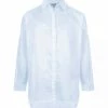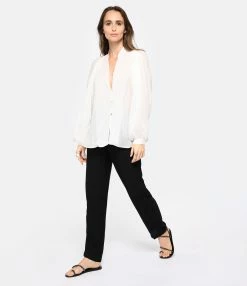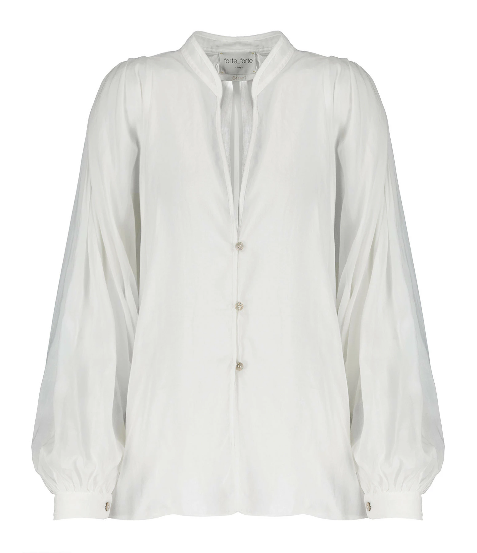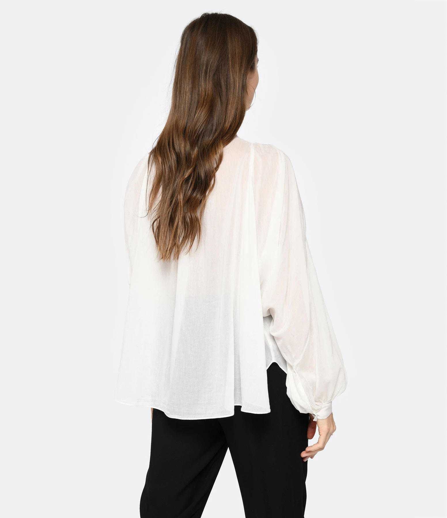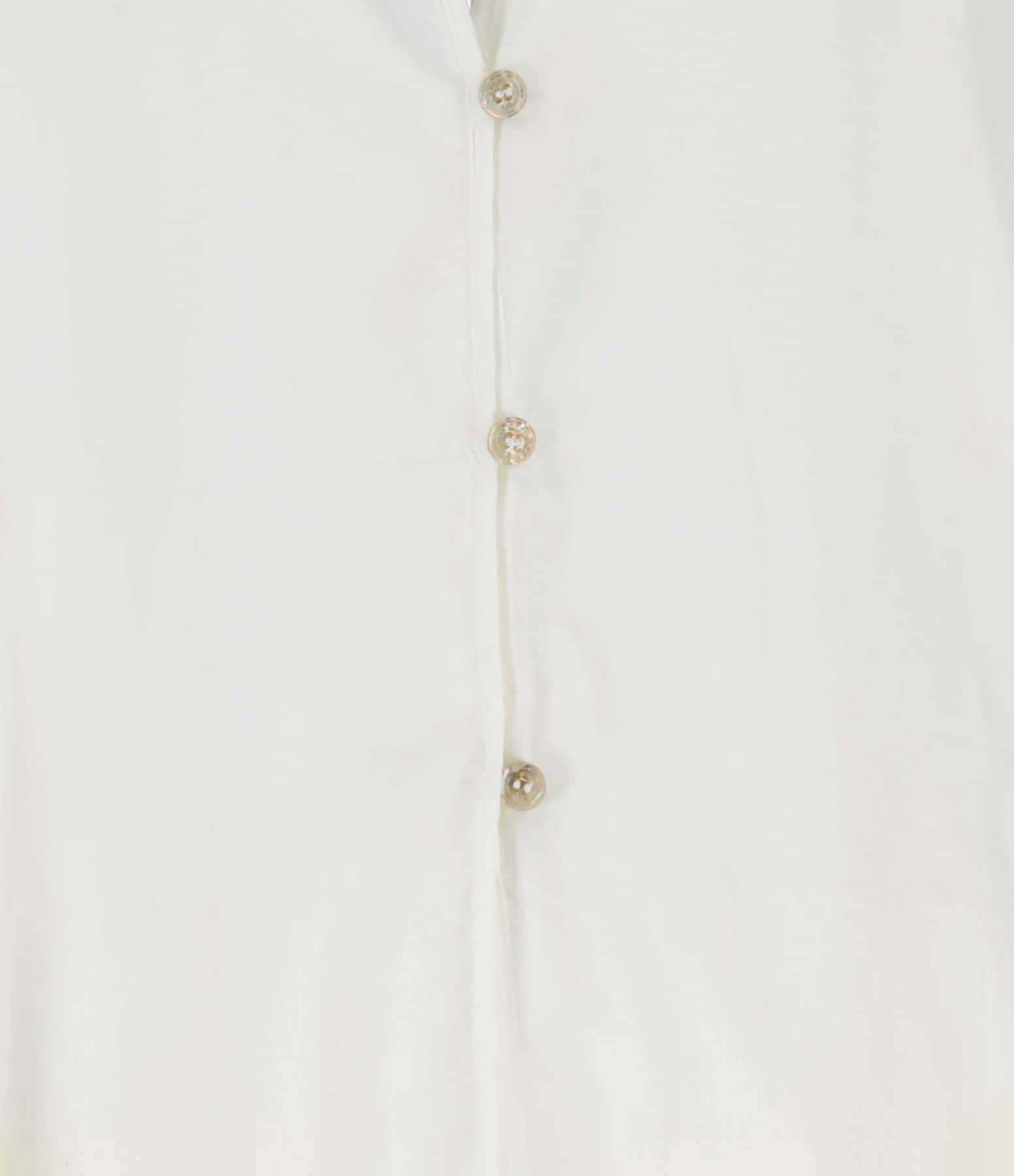 Chemise en coton et soie blanche. Col en V. Épaules et dos froncés. Manches longues avec fentes et poignets froncés et boutonnés. Fermeture boutonnée sur le devant. Petits boutons nacrés. Fentes latérales. Coupe large. Base arrondie.