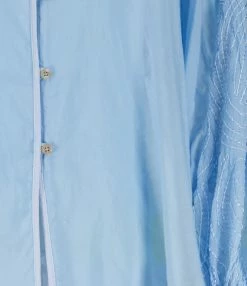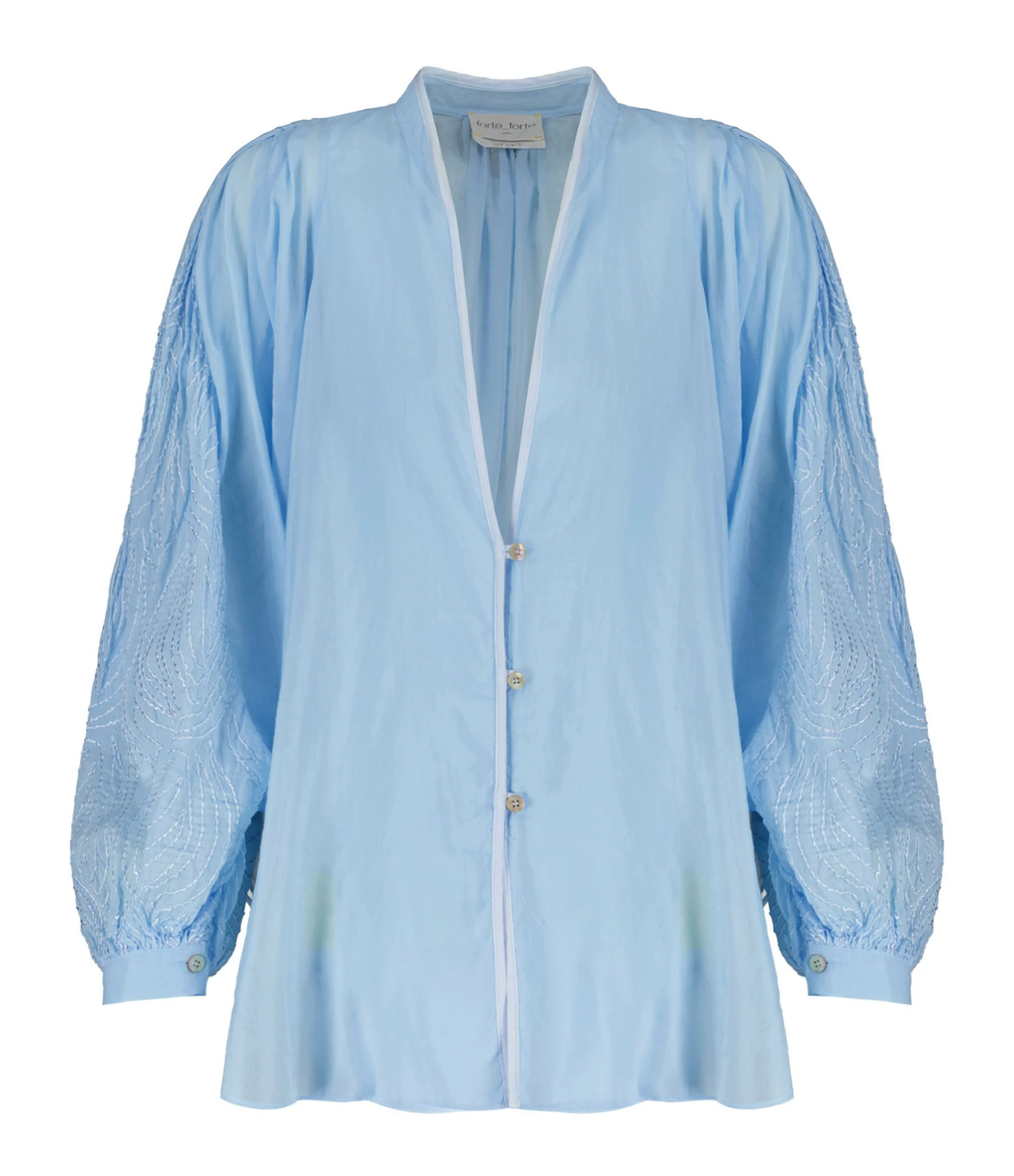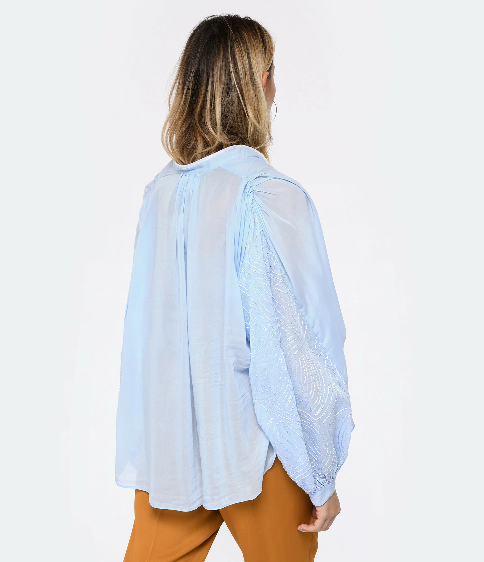 Chemise en coton et soie bleu. Col en V. Épaules froncées. Manches longues ornées de broderies avec fentes et poignets froncés et boutonnés. Fermeture boutonnée sur le devant. Petits boutons nacrés. Coupe large. Base arrondie.