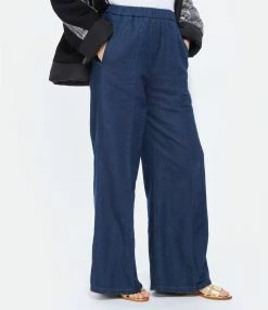 Pantalon en denim de coton bleu. Taille élastiquée. Quatre poches. Coupe large. Base droite.