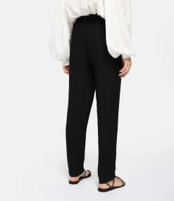 Pantalon en tissu fluide noir. Taille froncée et élastiquée. Deux poches prises dans la couture sur le devant. Coupe droite. Base droite. Doublé.