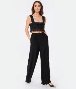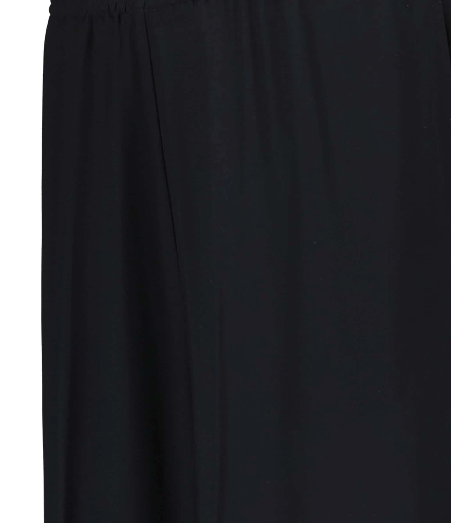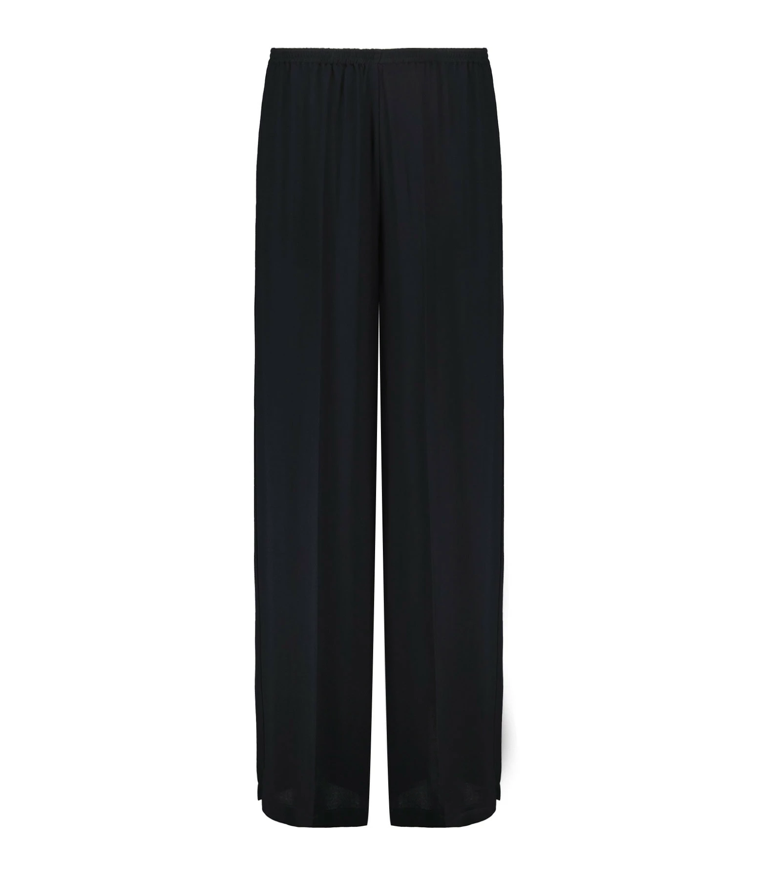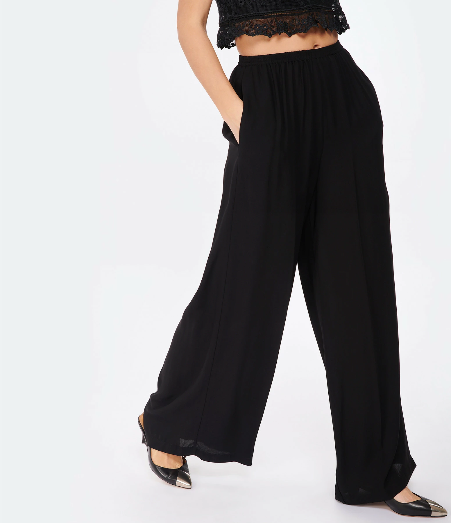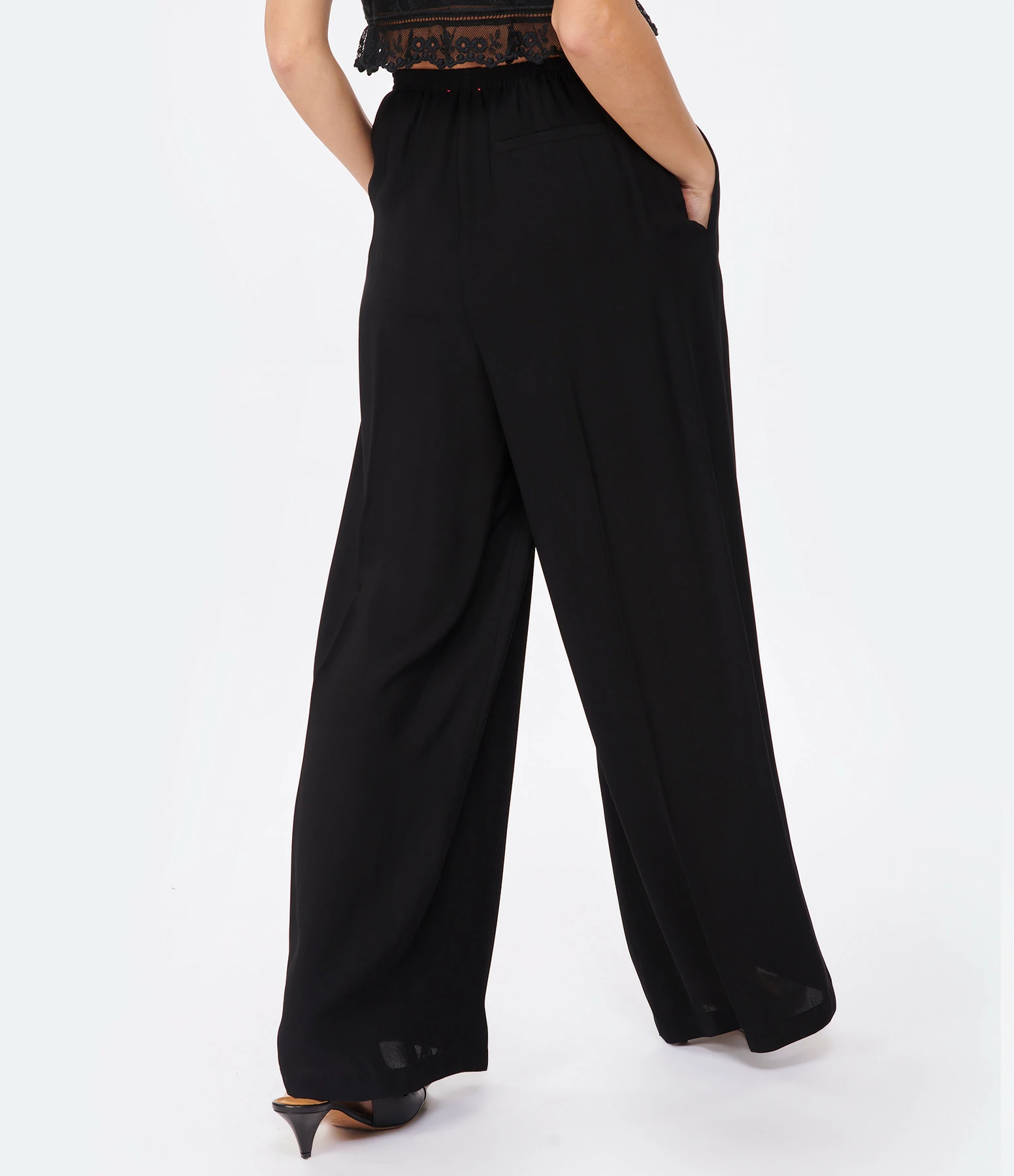 Pantalon en tissu fluide noir. Taille élastiquée. Deux poches prises dans la couture sur le devant. Une poche passepoilée dans le dos. Coupe large. Base droite.