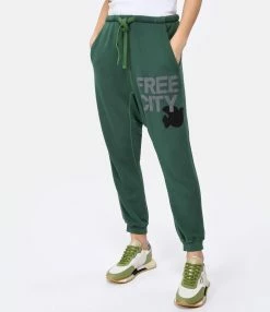 Pantalon jogging en coton molletonné vert foncé avec le logo Free City flocké sur le devant en gris et noir. Taille élastiquée avec cordon de serrage intérieur. Coupe droite. Base droite resserrée et élastiquée.