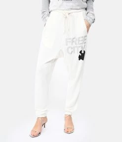 Pantalon jogging en coton molletonné crème avec le logo Free City flocké sur le devant en gris et noir. Taille élastiquée avec cordon de serrage intérieur. Coupe droite. Base droite resserrée et élastiquée.