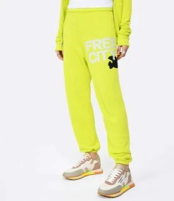 Pantalon jogging en coton molletonné jaune fluo avec le logo Free City flocké sur le devant en gris et noir. Taille élastiquée avec cordon de serrage intérieur. Coupe droite. Base droite resserrée et élastiquée.