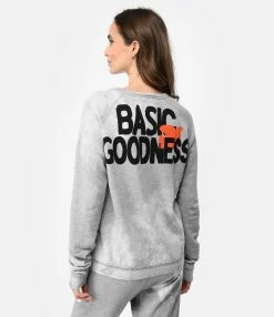 Pull en coton gris délavé. Personnage Snoopy sérigraphié sur le devant en noir. Inscription “BASIC GOODNESS” sérigraphiée à l’arrière en noir et rouge. Col rond. Manches longues. Coupe droite. Base droite.