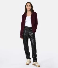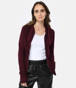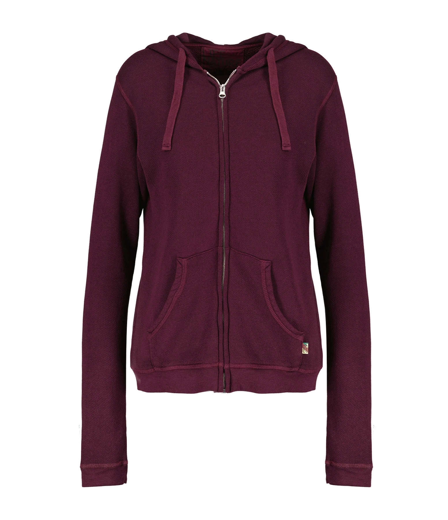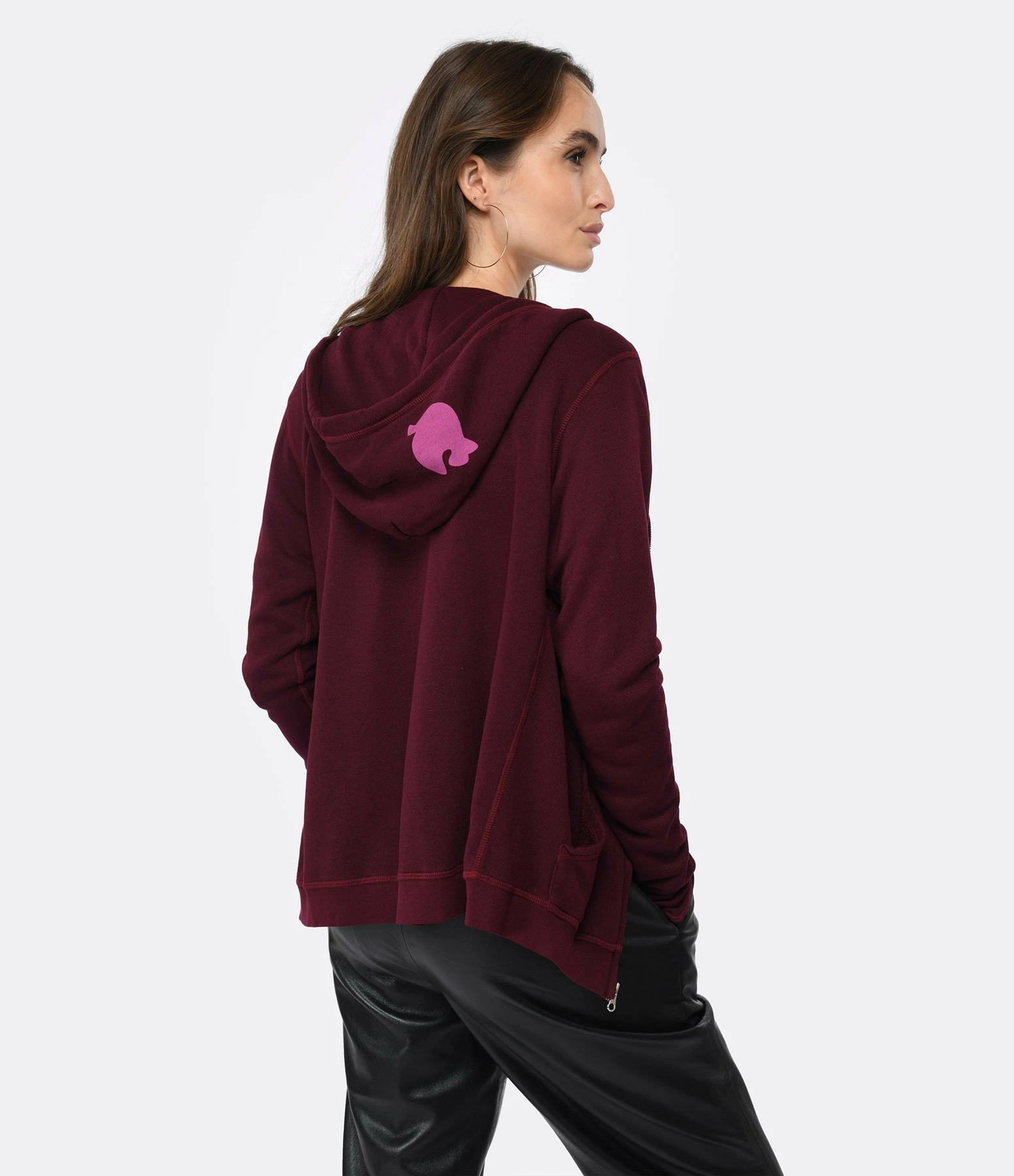 Veste à capuche bordeaux. Logo oiseau mauve sérigraphié sur la capuche. Capuche avec cordon de serrage. Fermeture par zip sur le devant. Manches longues. Deux poches à l’avant. Coupe droite. Base droite.