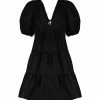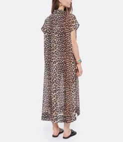 Robe longue sans manches imprimée léopard. Logo “Ganni” imprimé côté cœur. Tissu légèrement transparent. Col chemisier. Encolure en V. Grandes fentes latérales. Coupe droite. Base droite.