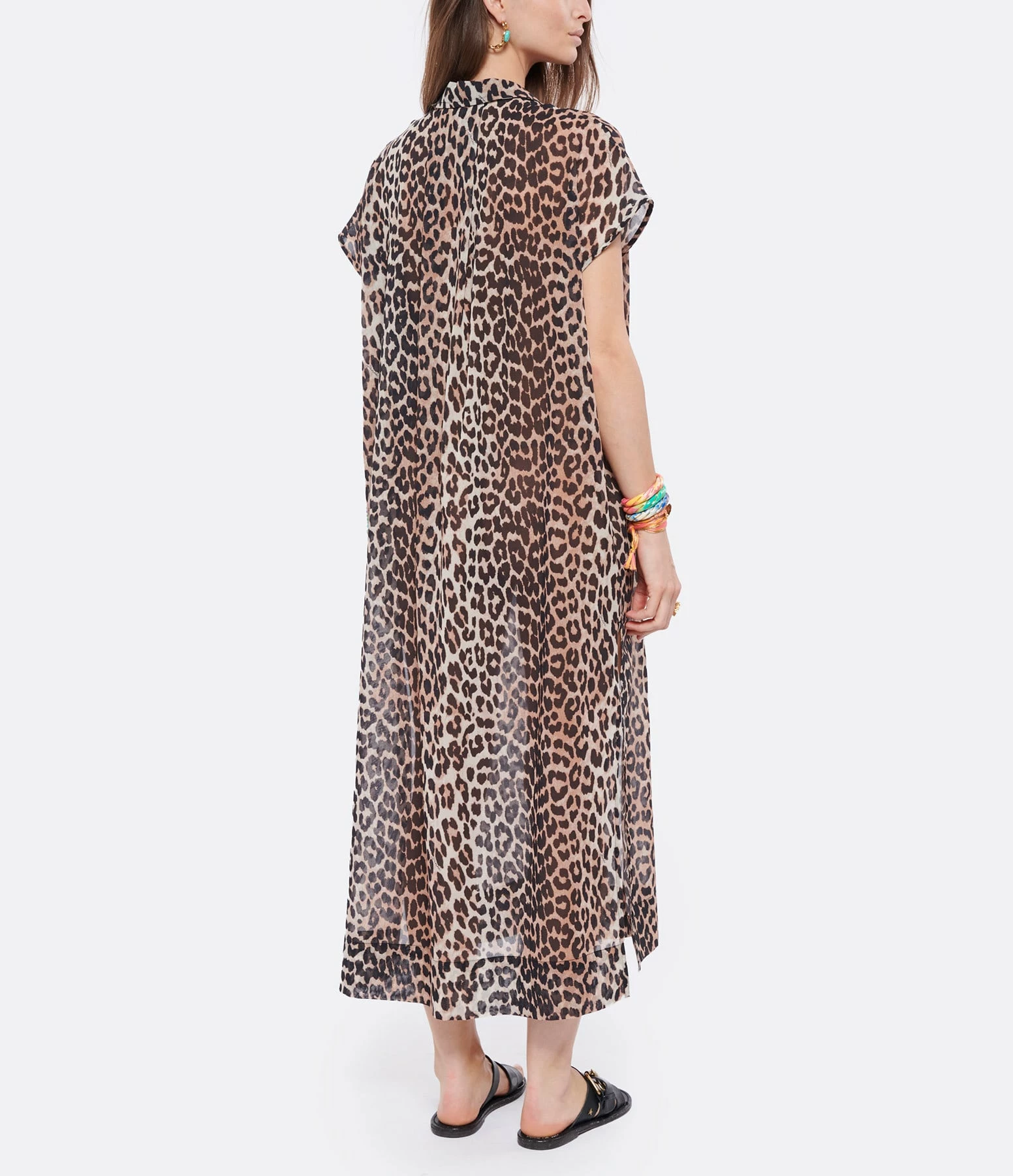 Robe longue sans manches imprimée léopard. Logo “Ganni” imprimé côté cœur. Tissu légèrement transparent. Col chemisier. Encolure en V. Grandes fentes latérales. Coupe droite. Base droite.