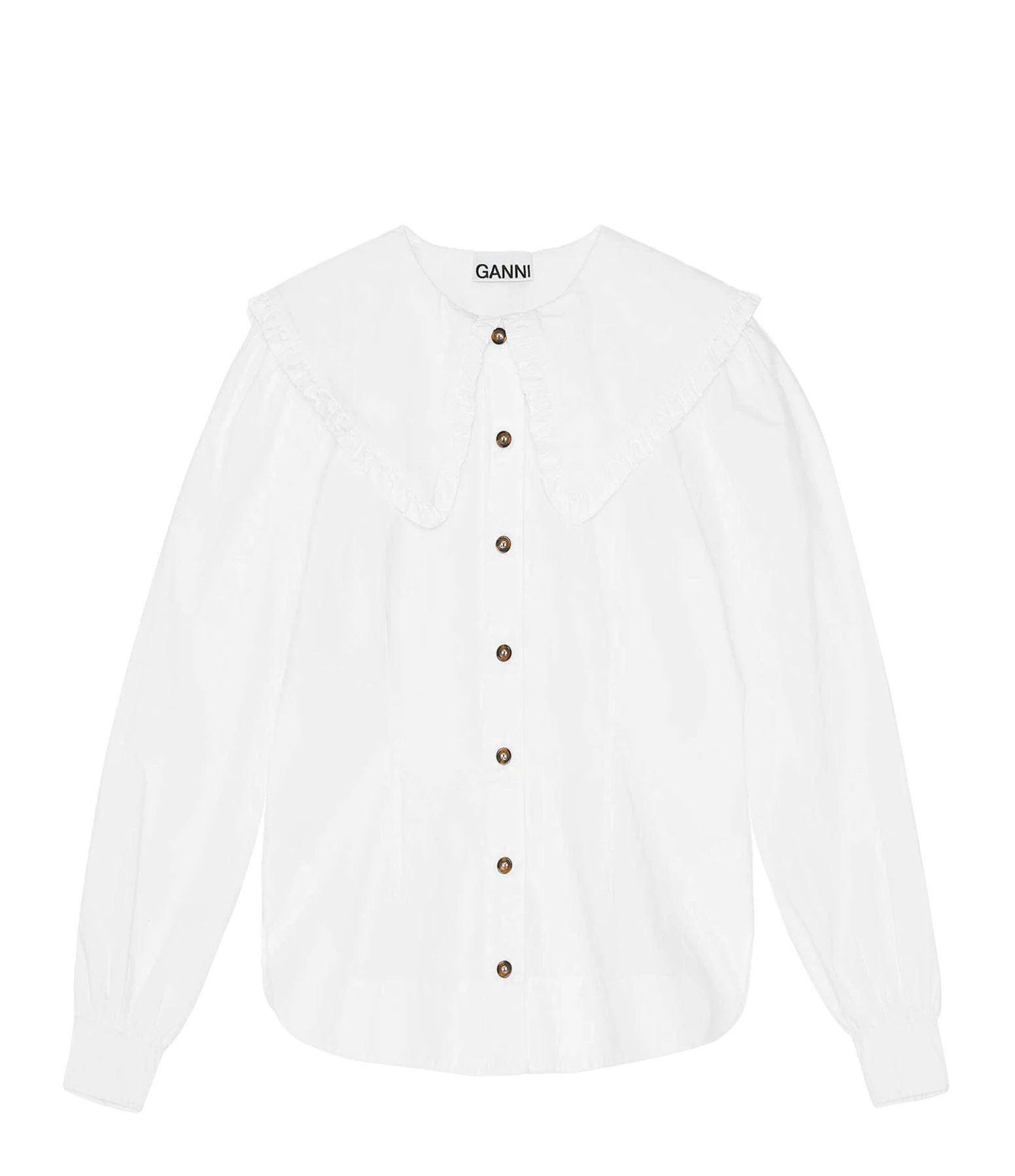 Chemise en coton biologique blanc. Col pelle à tarte volanté. Fentes latérales incurvées. Fermeture par boutons. Manches longues. Coupe droite. Base arrondie. Non doublée.