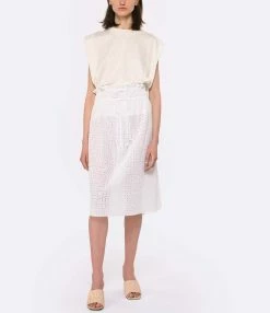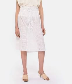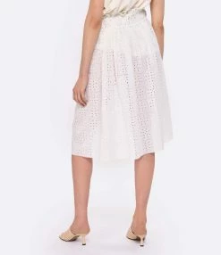 Jupe mi-longue en coton blanc effet broderie anglaise. Taille élastiquée avec lien de serrage. Ajouré. Coupe évasée. Base droite. Non doublée.