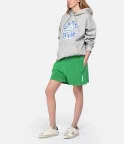 Sweatshirt en coton gris avec inscription “GANNI” flockée en bleu sur le devant. Capuche avec liens de serrage. Une poche kangourou à l’avant. Manches longues. Coupe droite. Base droite.
