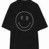 Tee-shirt en coton rose présentant une sérigraphie “smiley GANNI” en blanc et doré floquée à l’avant. Col rond. Manches courtes. Coupe droite. Base droite.