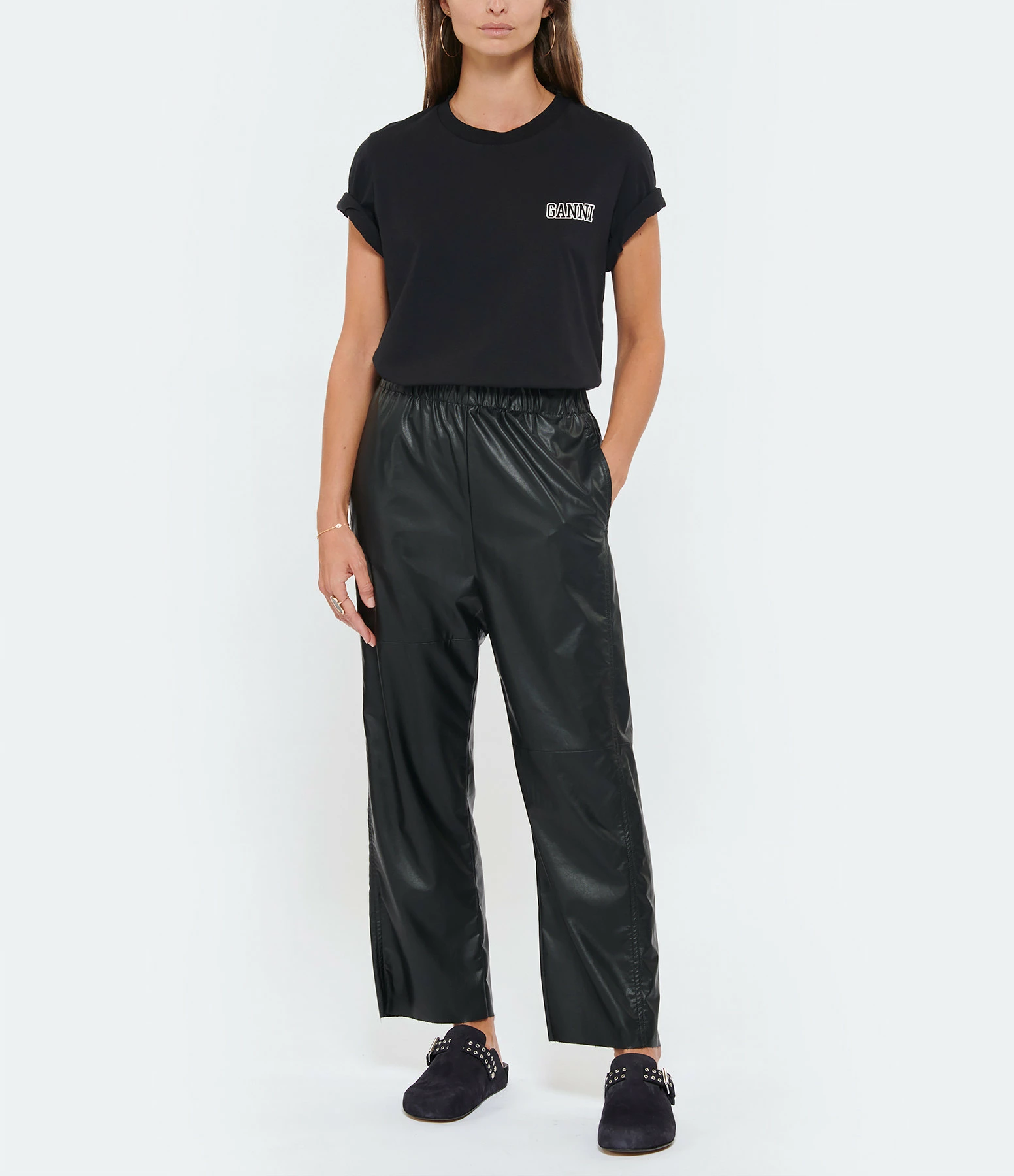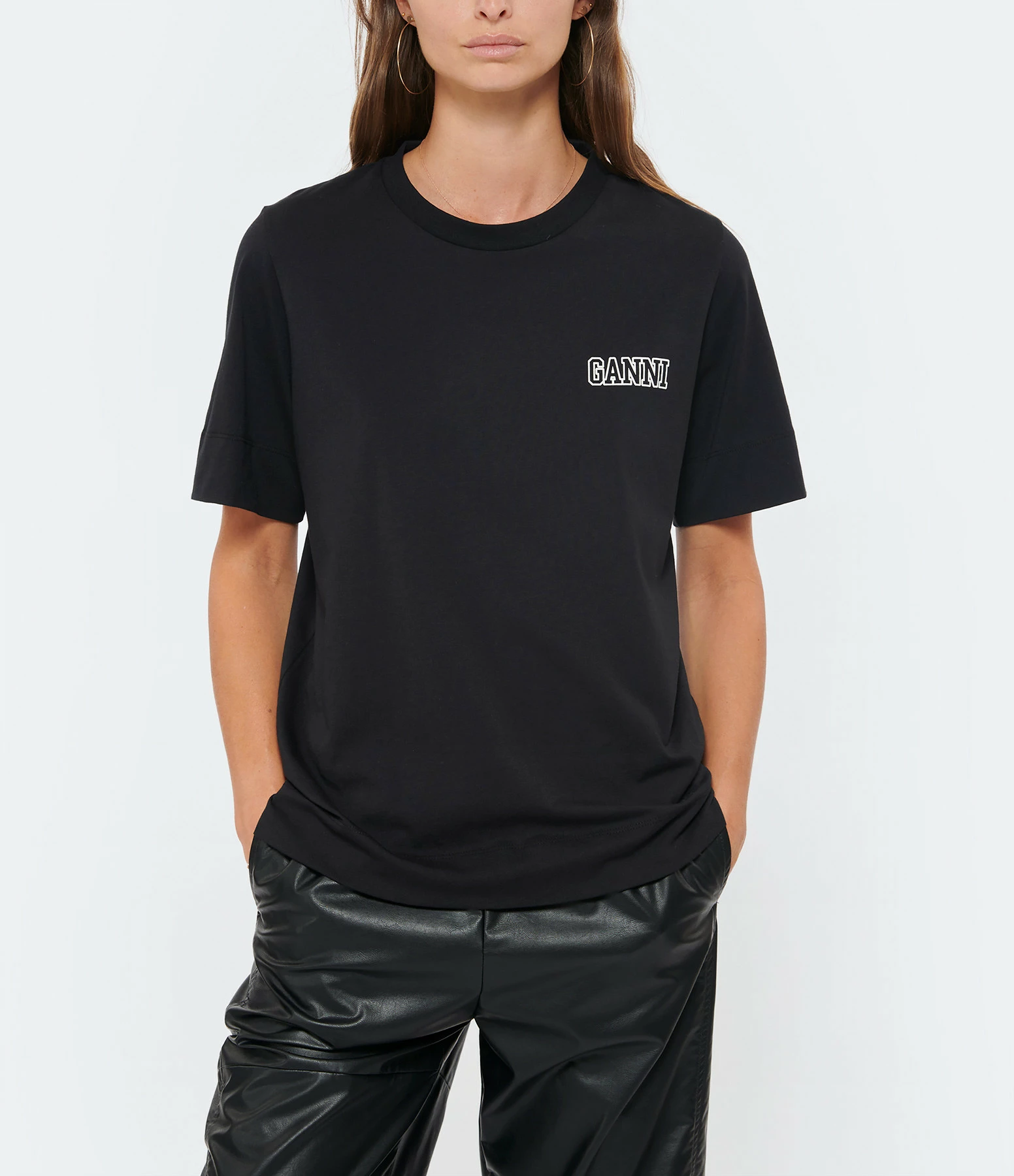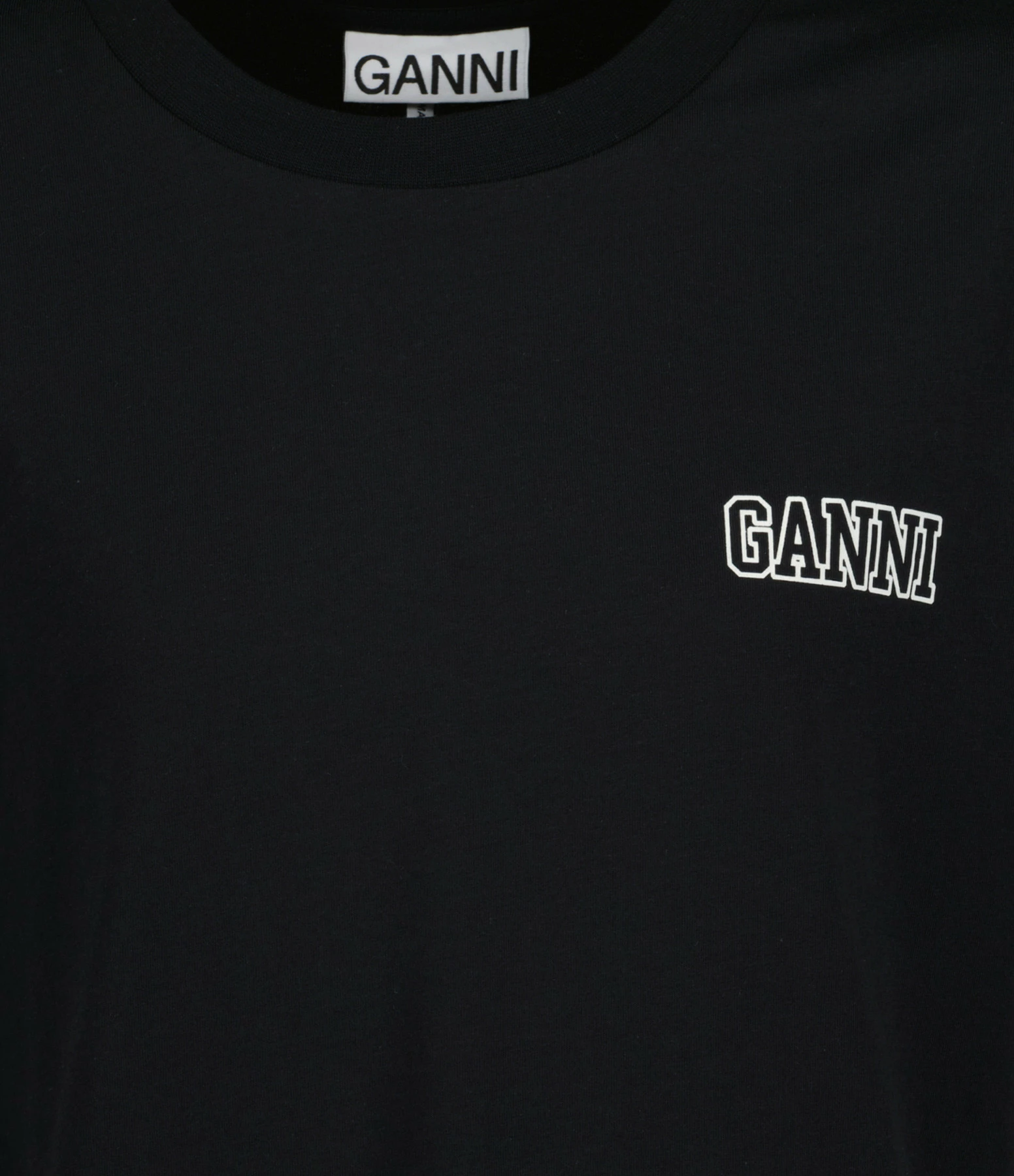 Tee-shirt en coton noir. Col rond. Manches courtes. Broderie blanche “GANNI” sur la poitrine. Coupe droite. Base droite. Petites fentes sur les cotés.