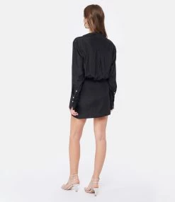 Robe en soie noire encolure chemise et décolleté plongeant. Poignets ornés de boutons Swarovski®. Manches longues. Jupe plissée côté gauche. Fermeture zippée latérale. Doublée.
