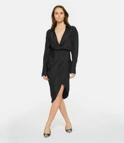 Robe mi-longue en soie noire. Plissée au niveau de la taille. Décolleté en V. Manches longues. Fermeture invisible latérale. Coupe droite. Base asymétrique.