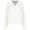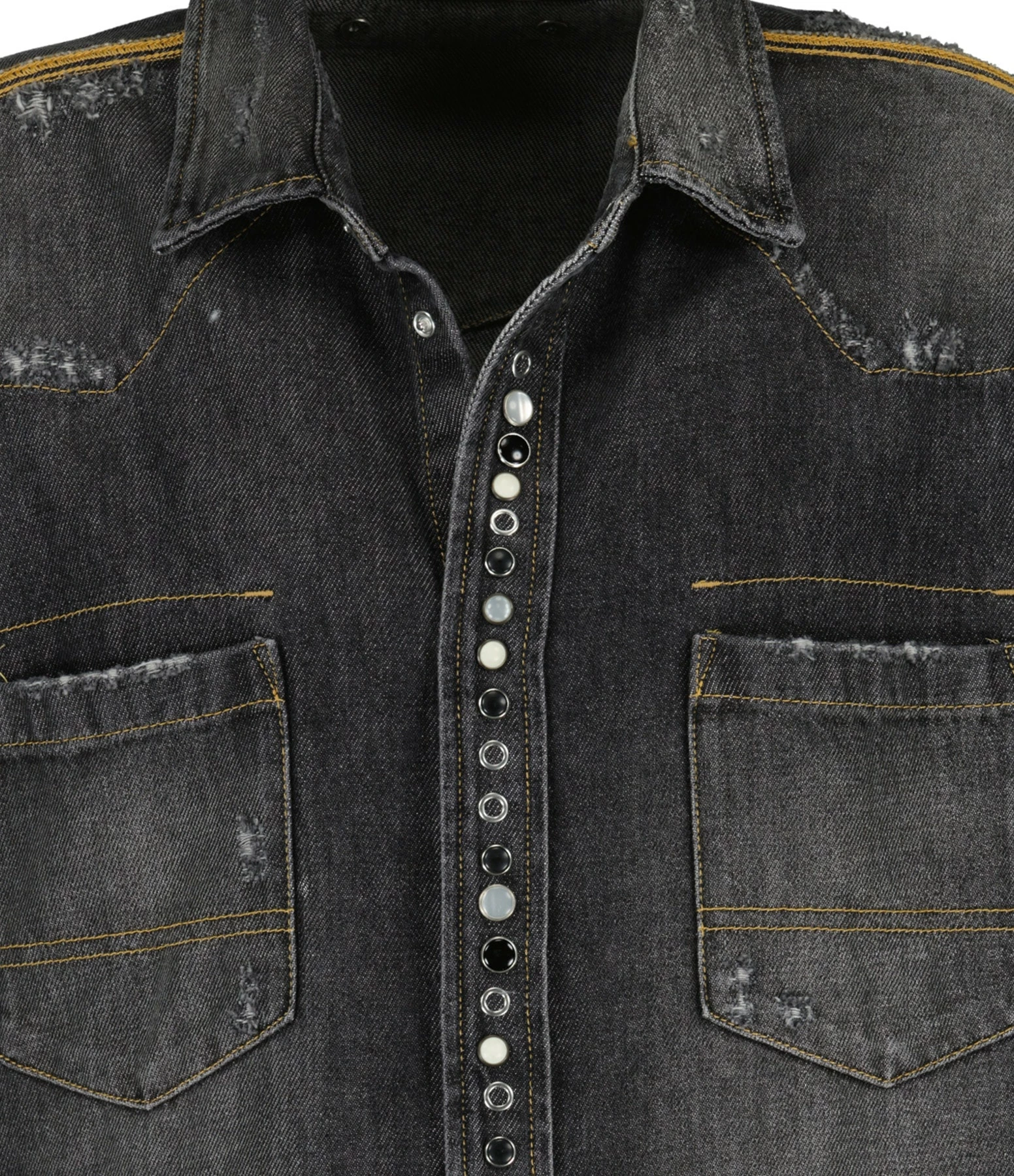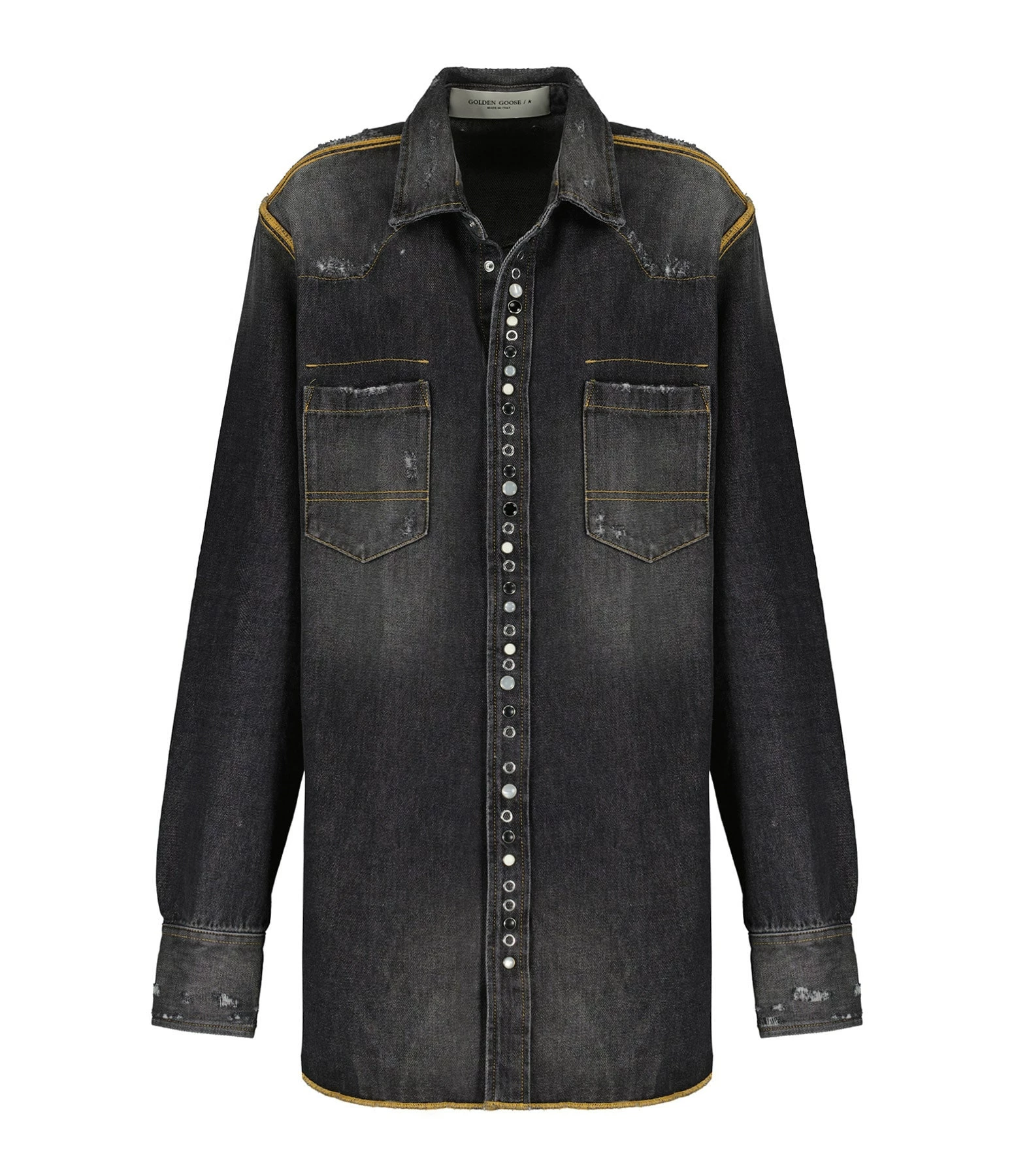 Chemise en denim noir délavé pour homme. Surpiqûres dorées. Col chemisier. Manches longues. Deux poches poitrines. Effets usés volontairement. Fermeture par boutons. Coupe droite. Base arrondie.
