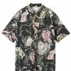 Chemise en tissu fluide marron doré imprimé de motifs inspirés des journaux intimes des voyageurs bleu encre. Col chemise. Manches longues avec fentes et poignets boutonnés. Fermeture boutonnée à patte de boutonnage cachée sur le devant. Double étoile en métal doré dans le dos. Fentes latérales. Coupe droite longue. Base arrondie. Non doublée.
