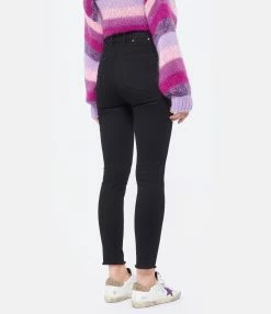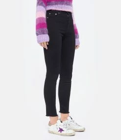 Jean slim en denim noir. Cinq poches. Fermeture par zip et bouton. Passants pour ceinture. Bas de jambes coupé à cru avec franges. Coupe slim.