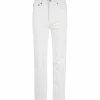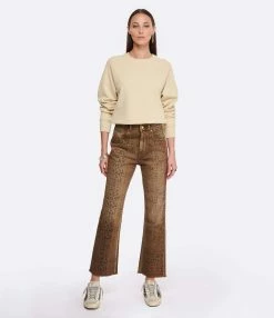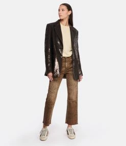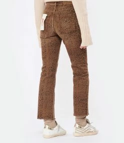 Jean en denim à imprimé léopard marron. Cinq poches. Pièce amovible blanche avec la lettre “G” rouge brodée cousue sur la poche gauche arrière. Fermeture par zip et bouton. Passants pour ceinture. Coupe droite. Bas de jambe frangé.