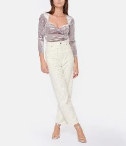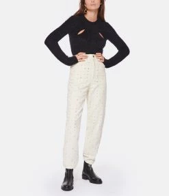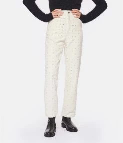 Jean en coton écru. Perles et cristaux brodés. Cinq poches. Fermeture par zip et bouton. Volontairement troué et usé. Coupe large. Base droite.