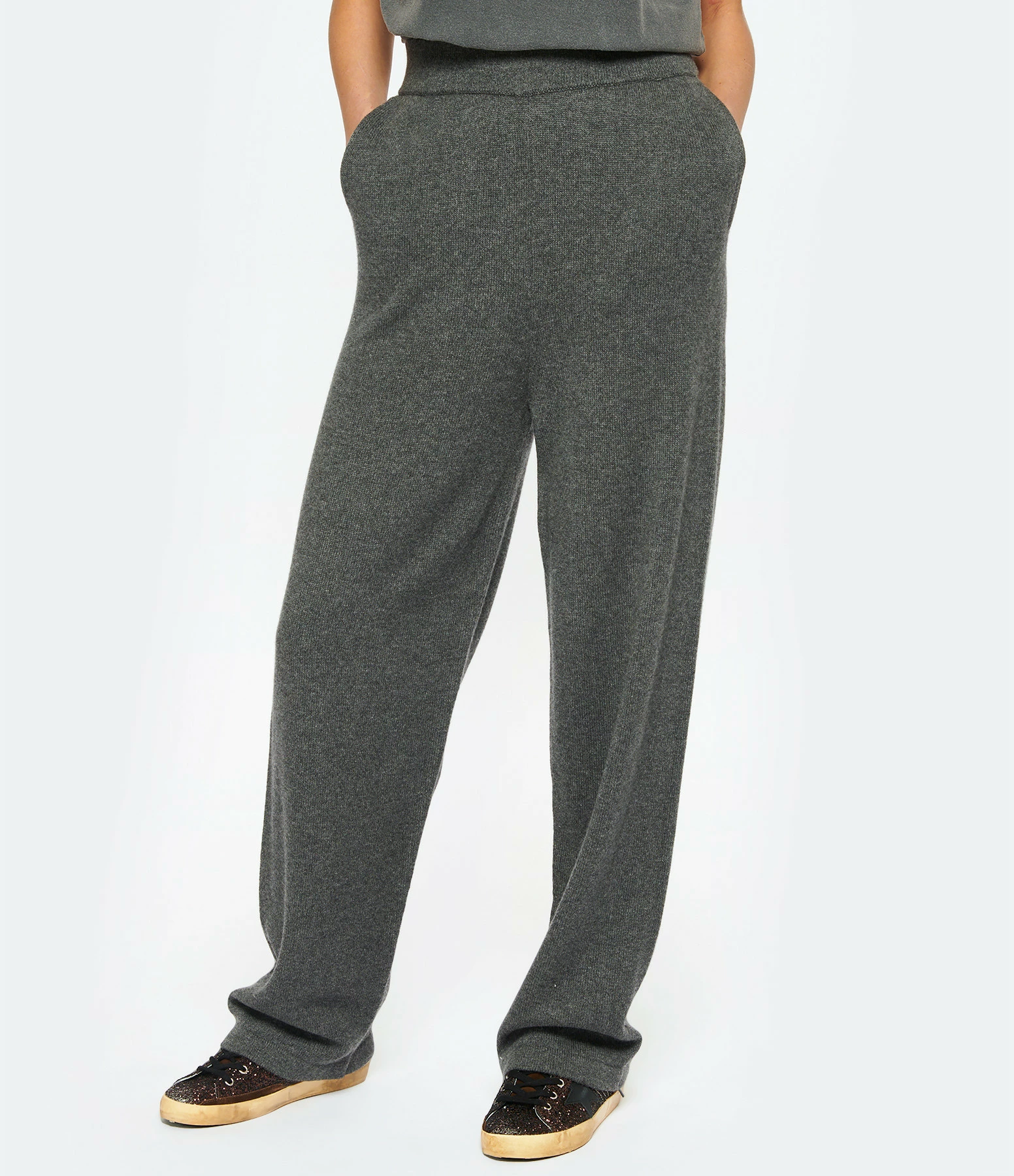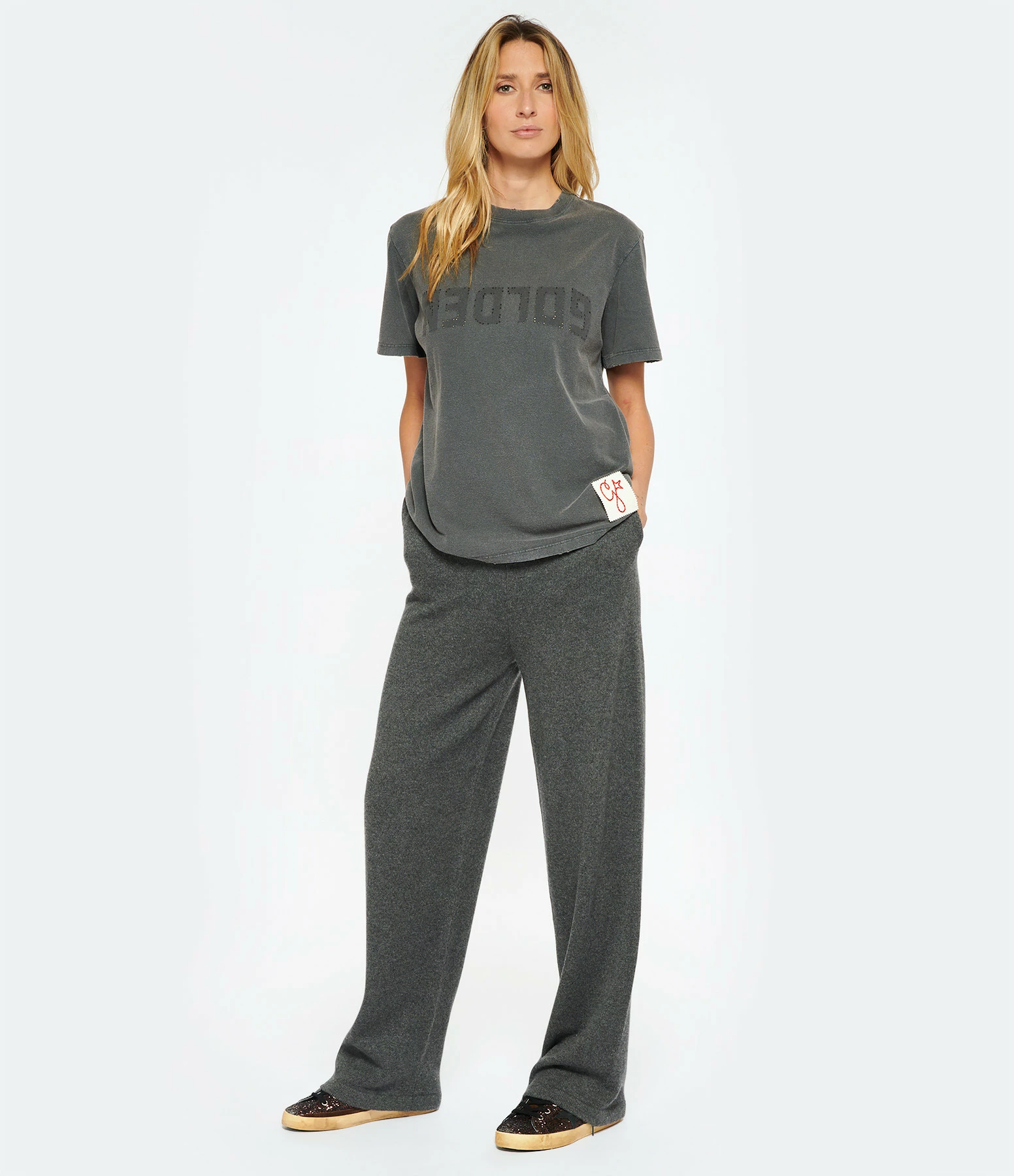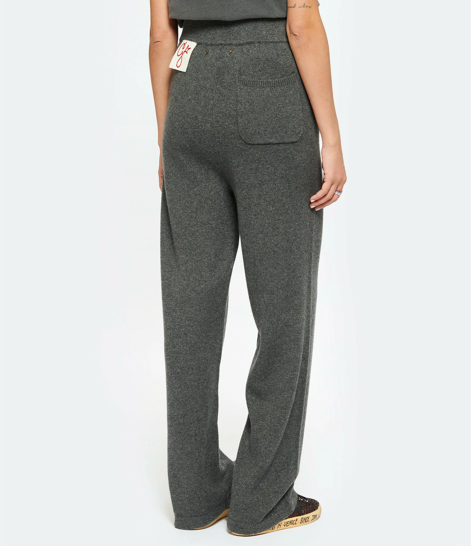 Jogging en cachemire gris. Taille élastiquée. Deux poches italiennes et une poche plaquée à l’arrière. Pièce amovible blanche avec la lettre G rouge brodée à l’arrière. Coupe droite.