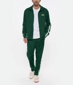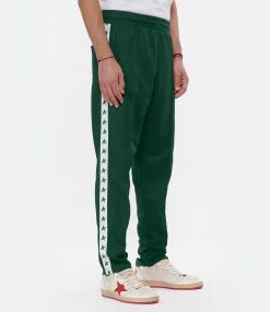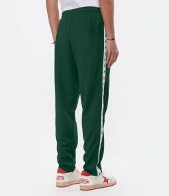 Pantalon de jogging vert. Ceinture élastiquée avec liens de serrage à l’intérieur. Bandes blanches latérales avec des étoiles vertes imprimées. Deux poches raglans sur le devant. Une poche plaquée dans le dos. Coupe ajustée. Base droite.