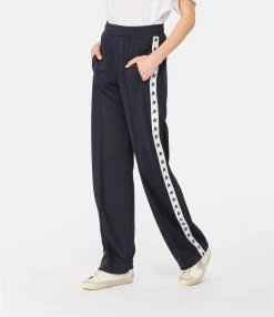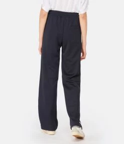 Pantalon de jogging bleu foncé. Taille élastiquée avec liens de serrage à l’intérieur. Bandes blanches latérales en gros grain avec série logo étoile imprimée en bleu. Deux poches passepoilées sur le devant. Une poche plaquée dans le dos. Coupe large. Base droite. Non doublé.