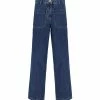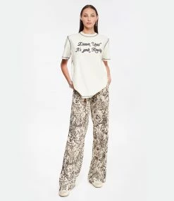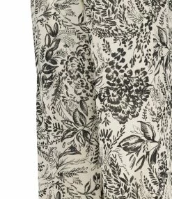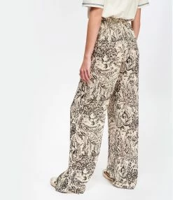 Pantalon fluide blanc cassé à imprimé floral noir. Taille élastiquée froncée. Deux poches prises dans les coutures latérales sur le devant. double logo étoile en métal bronze dans le dos. Coupe large. Base droite.