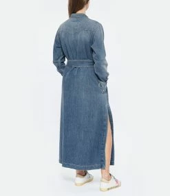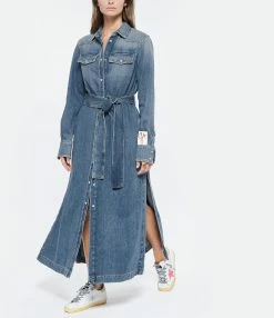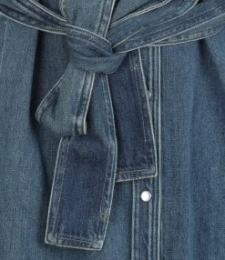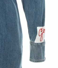 Robe chemise longue en denim bleu. Col chemise. Manches longues amples avec fentes. Poignets pressionnés. Pièce amovible blanche avec la lettre “G” rouge brodée sur la manche gauche. Fermeture pressionnée. Deux poches à rabats pressionnées poitrine. Deux poches prises dans les coutures côtés. Deux fentes latérales. Une ceinture amovible à nouer. Passants pour ceinture. Empiècement dans le dos. Logo étoile métallique cousu dans le dos. Coupe droite. Base droite. Non doublée.