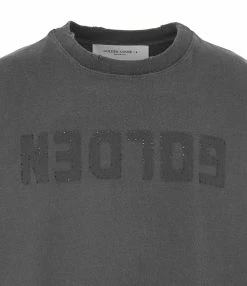 Robe t-shirt en coton gris avec lettres contrastantes. Manches courtes. Effet usé sur le col, les manches et la base. Coupe droite. Base droite.